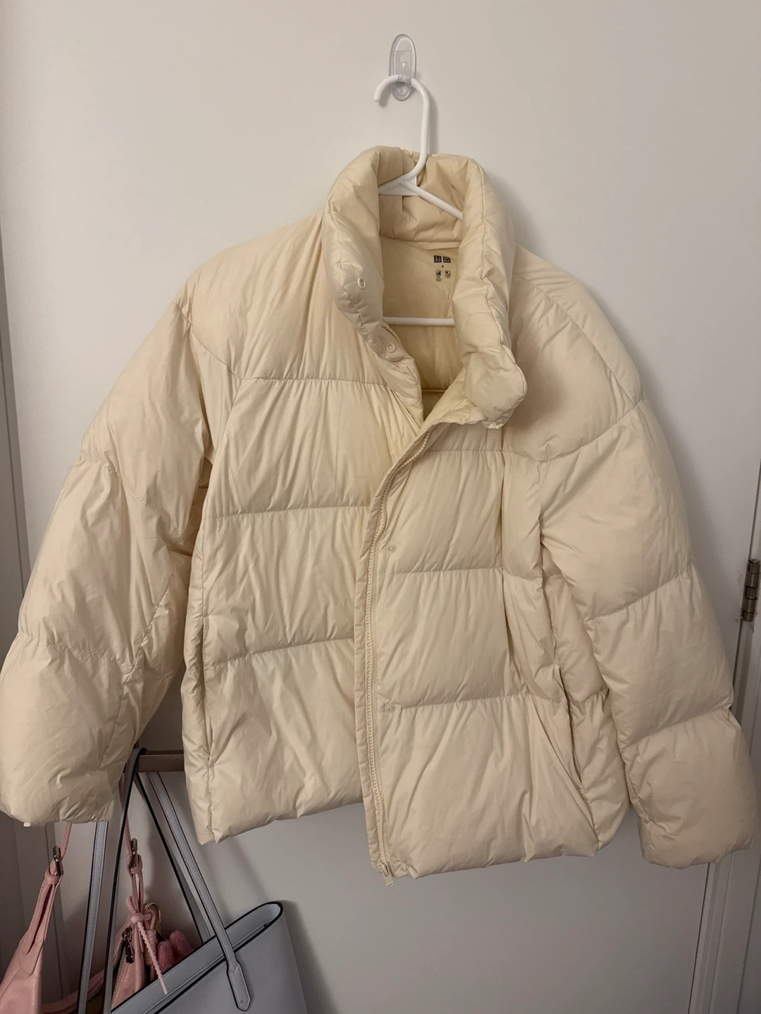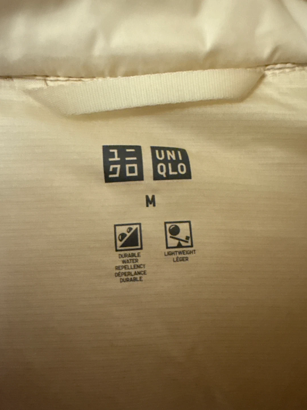 This cream UNIQLO puffer jacket is a size medium. It's lightweight and features durable water repellency. Perfect for staying warm and dry on cooler days!