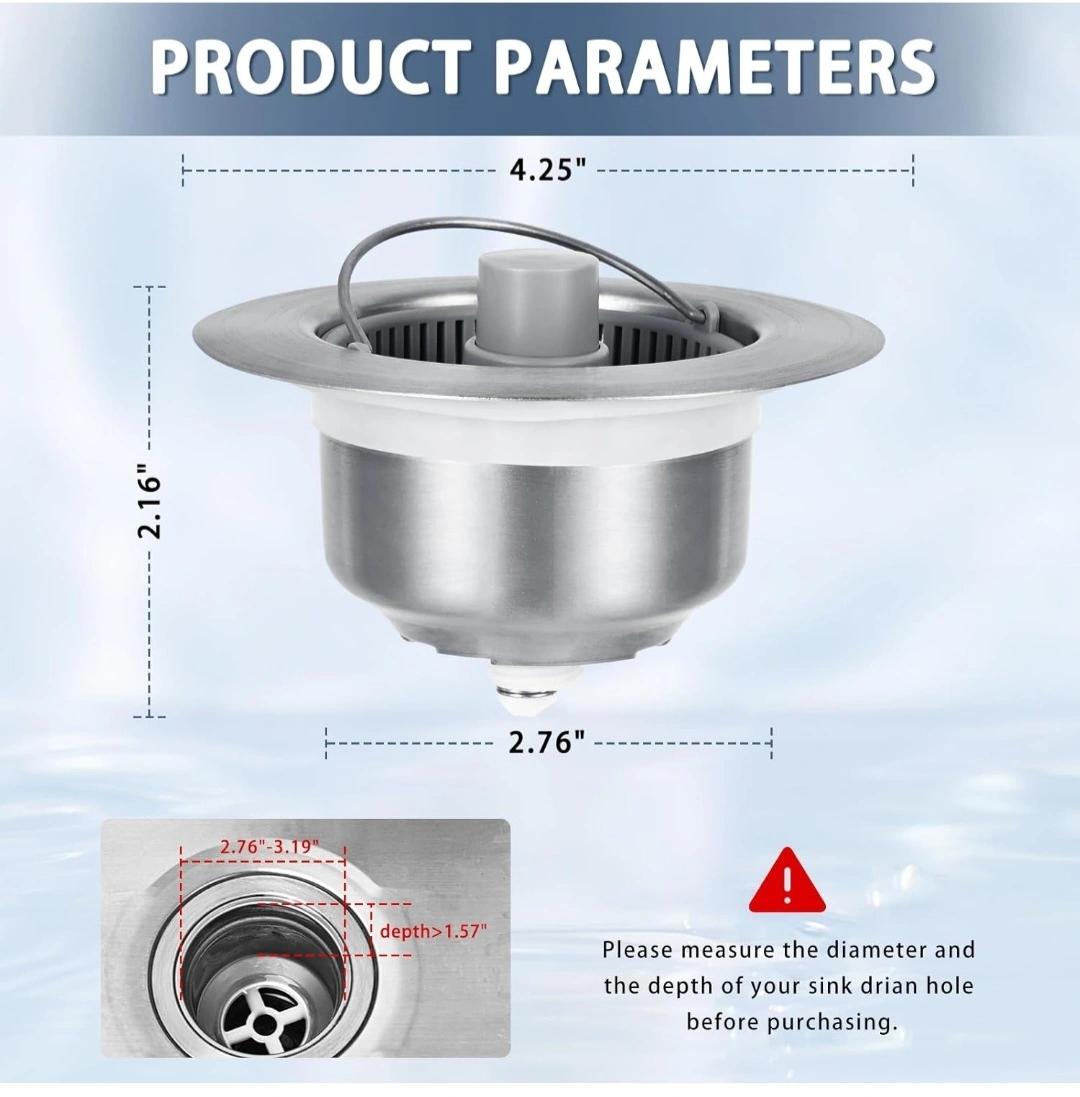 NOTICE: The sink bounce core drain strainer is suitable for deep kitchen drain pipe sizes, with a diameter of 70-81 mm/2.76-3.19 inches and a depth of>40 mm/1.57 inches. Please measure the diameter and depth of the sink drainage pipe before purchasing.