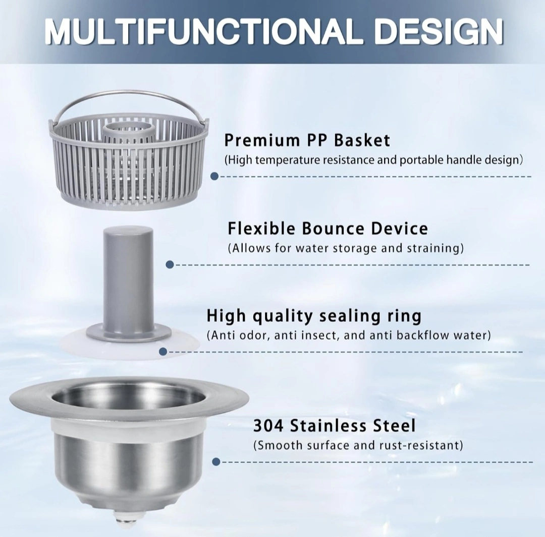 ✅3-IN-1 SINK DRAIN STRAINER:The kitchen sink strainer combines water storage, filtration, and odor prevention in one sleek package. Its multi-layer seal design ingeniously blocks drain odors and ensures leak-proof water retention. Crafted with a high-quality PP basket and equipped with a handy portable grip, it effectively strains kitchen waste and makes cleanup a breeze.