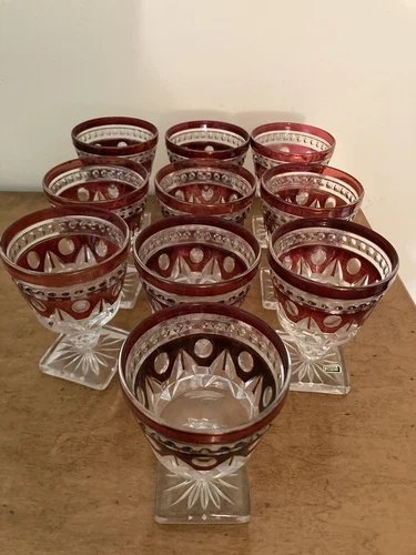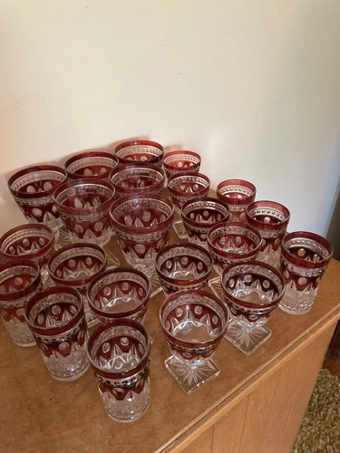 This is a vintage set of Indiana Glass Colony Park Lane Ruby Red glassware, featuring 22 pieces in total. The rich red hue and Colonial style make this a beautiful addition to any bar or dining area.