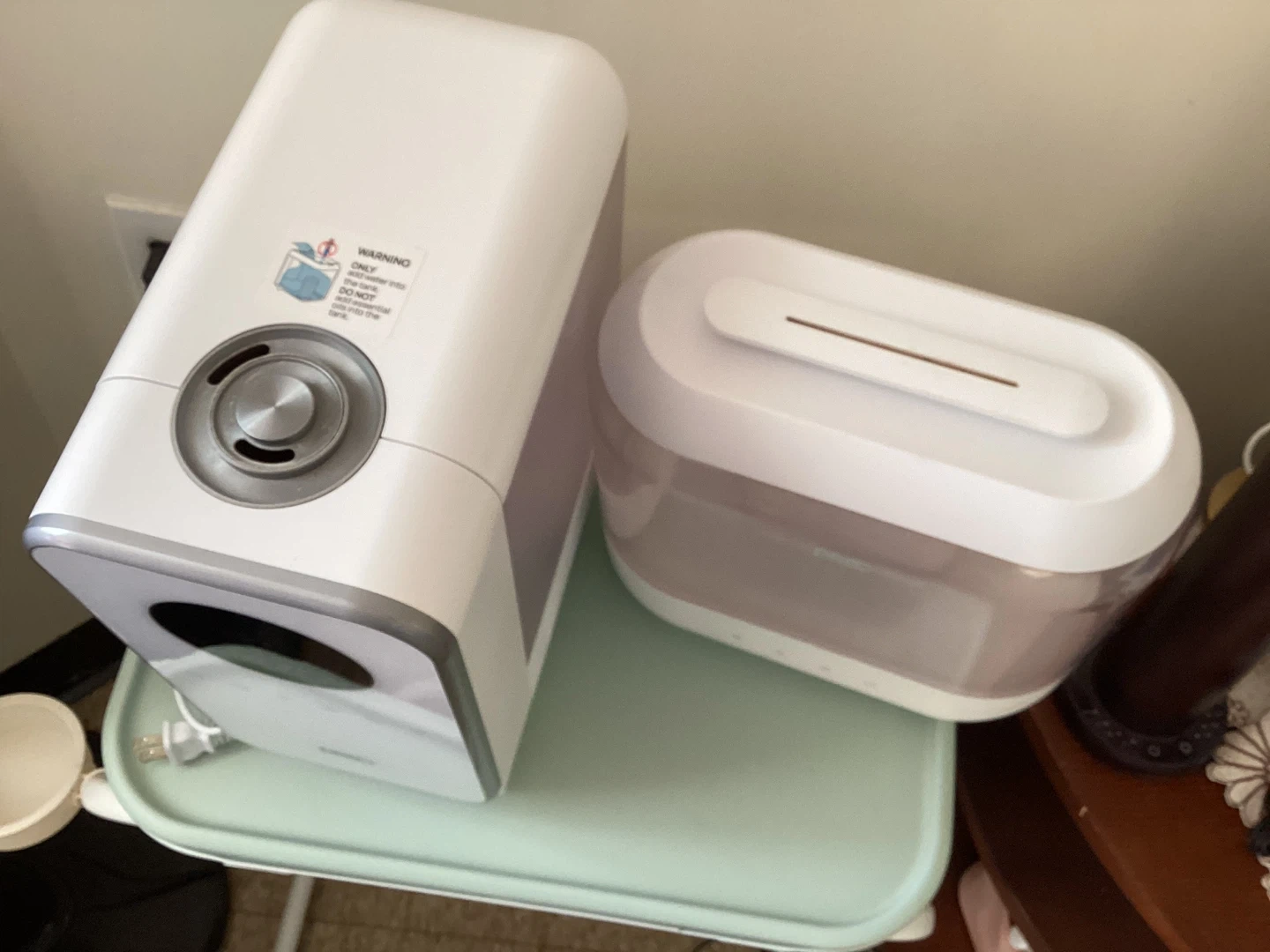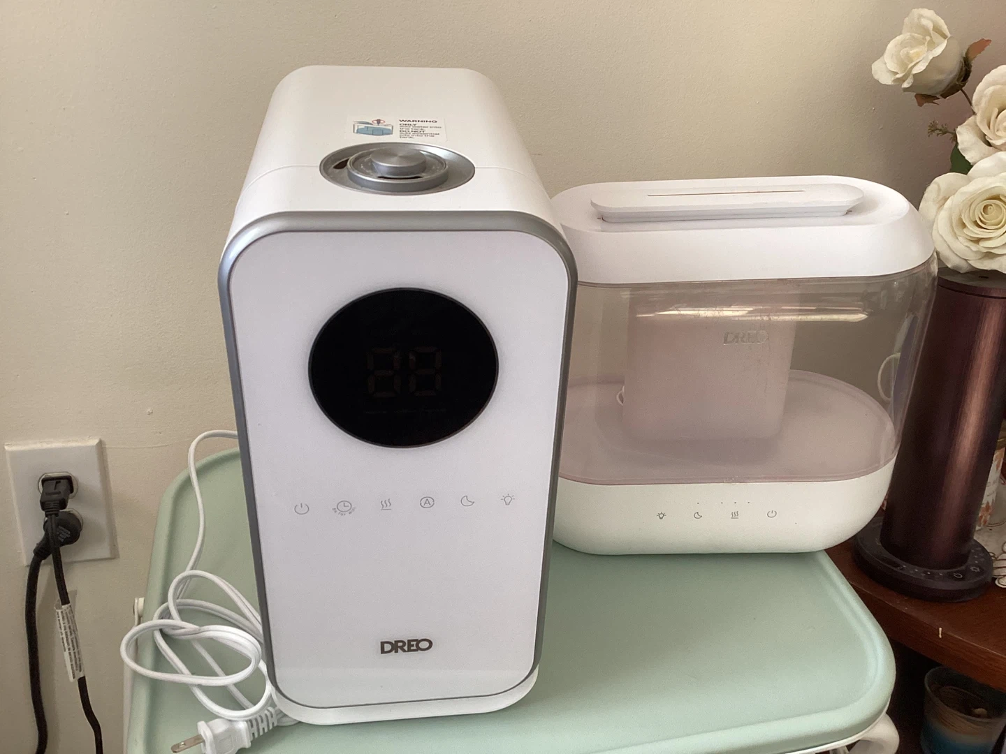 This is a Dreo humidifier. It's white and has a clear water tank. The unit has a digital display and control panel.
