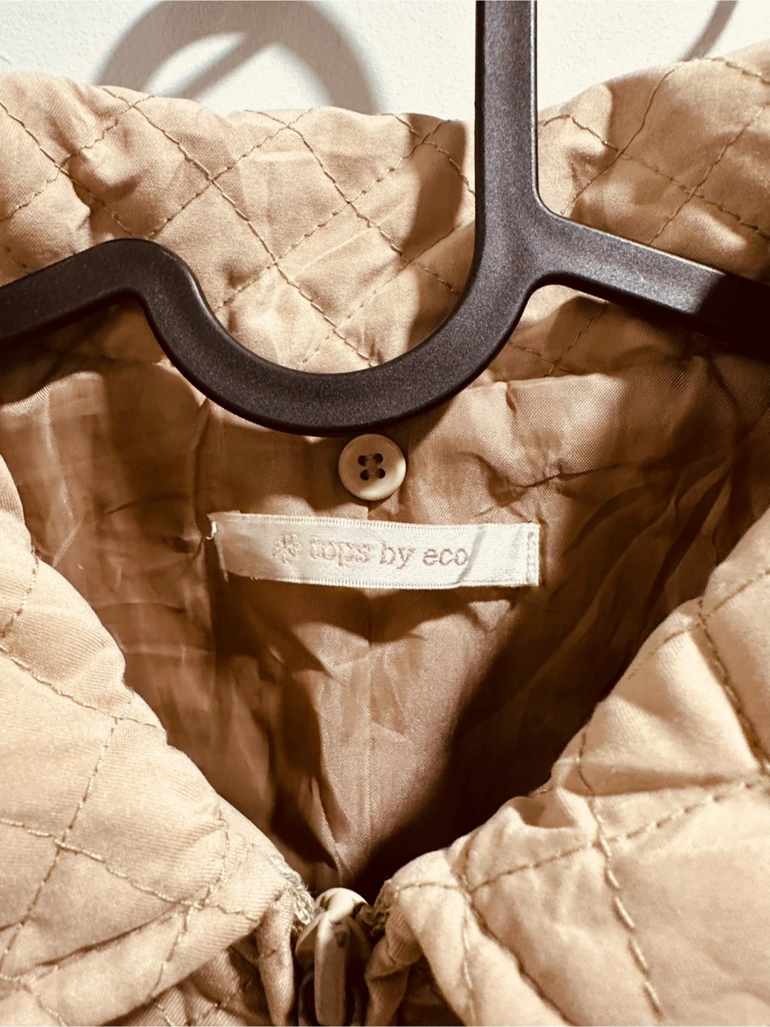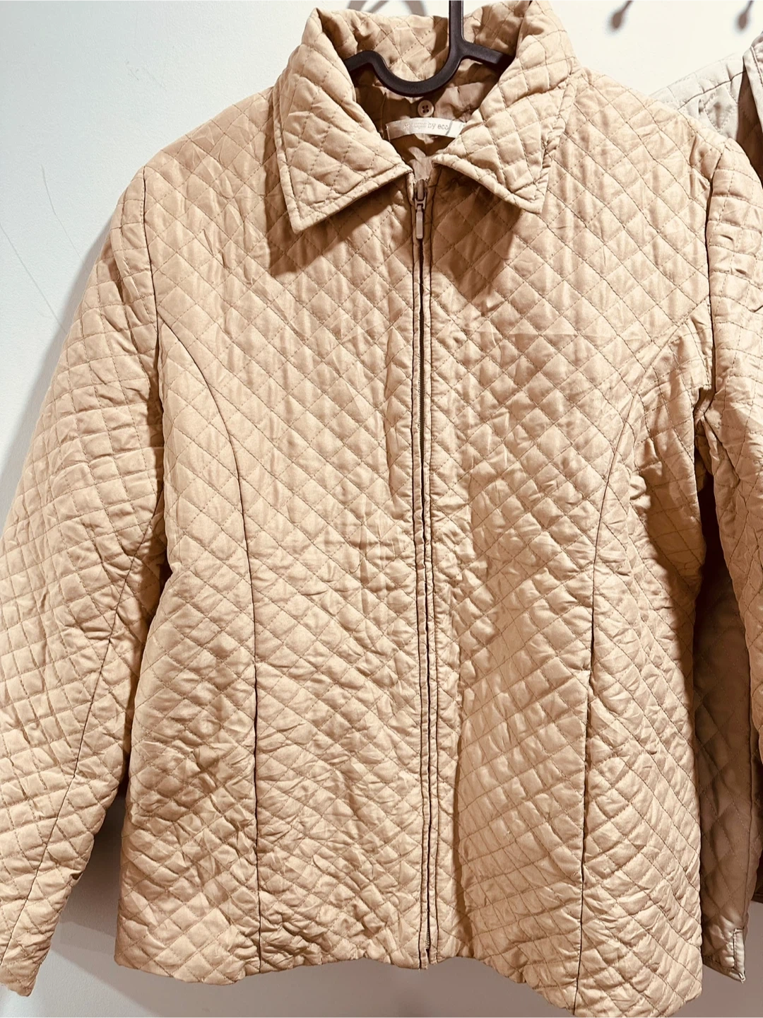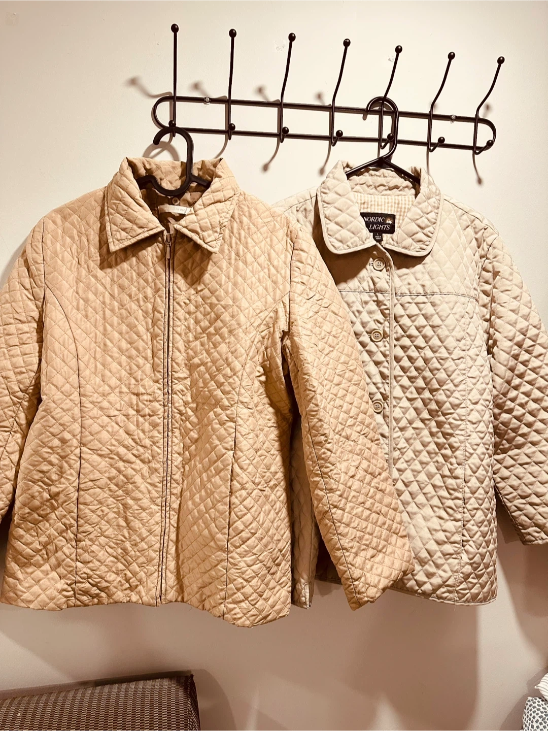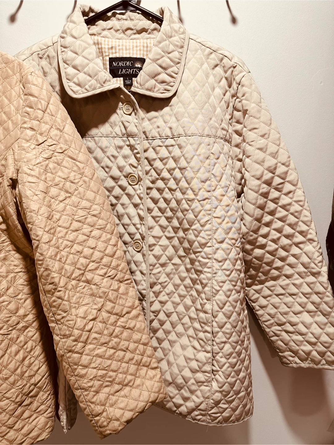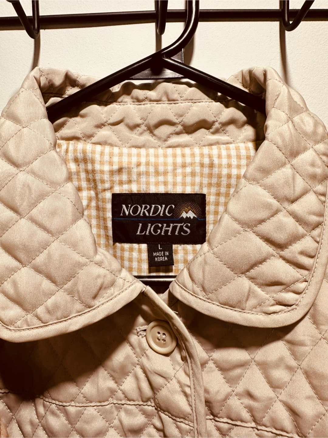 This is a Nordic Lights quilted jacket. It's a size large and features a full zip closure with buttons. The lining is a tan and white checkered pattern.