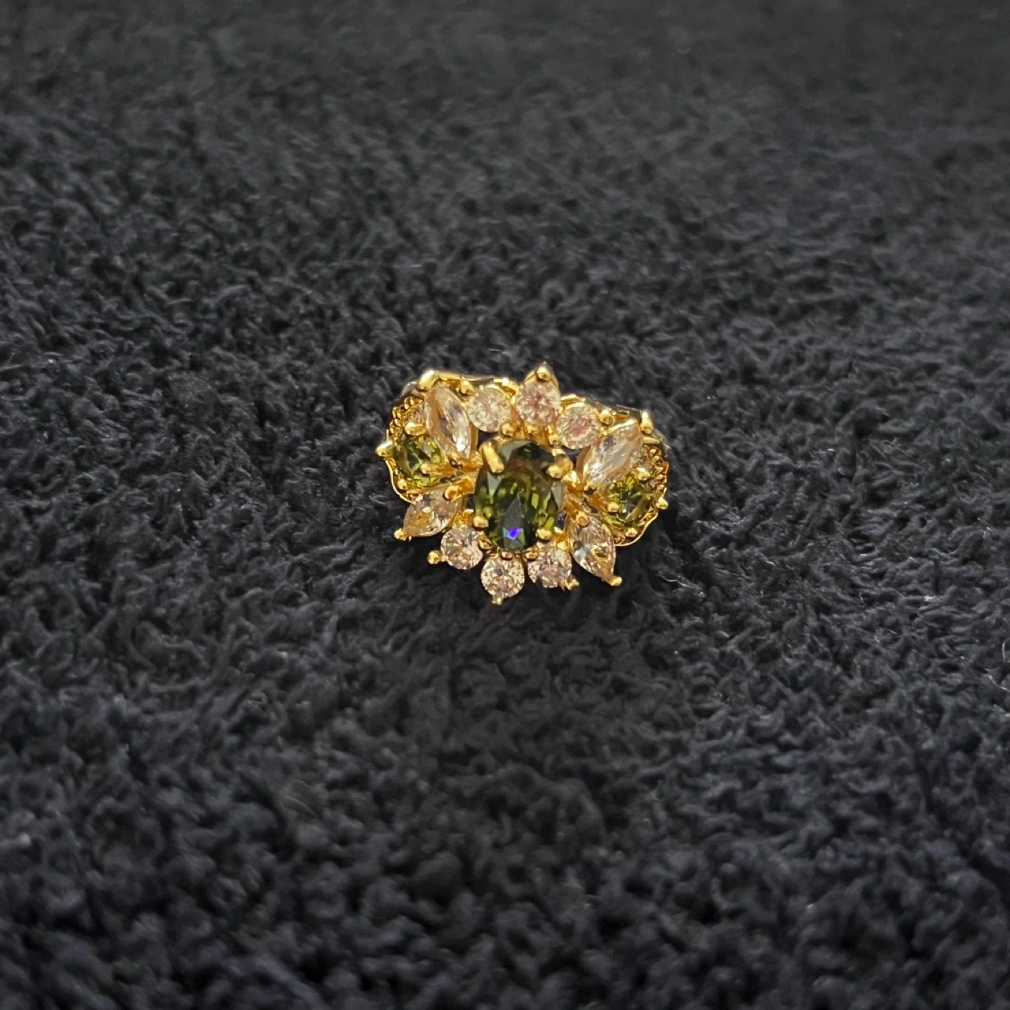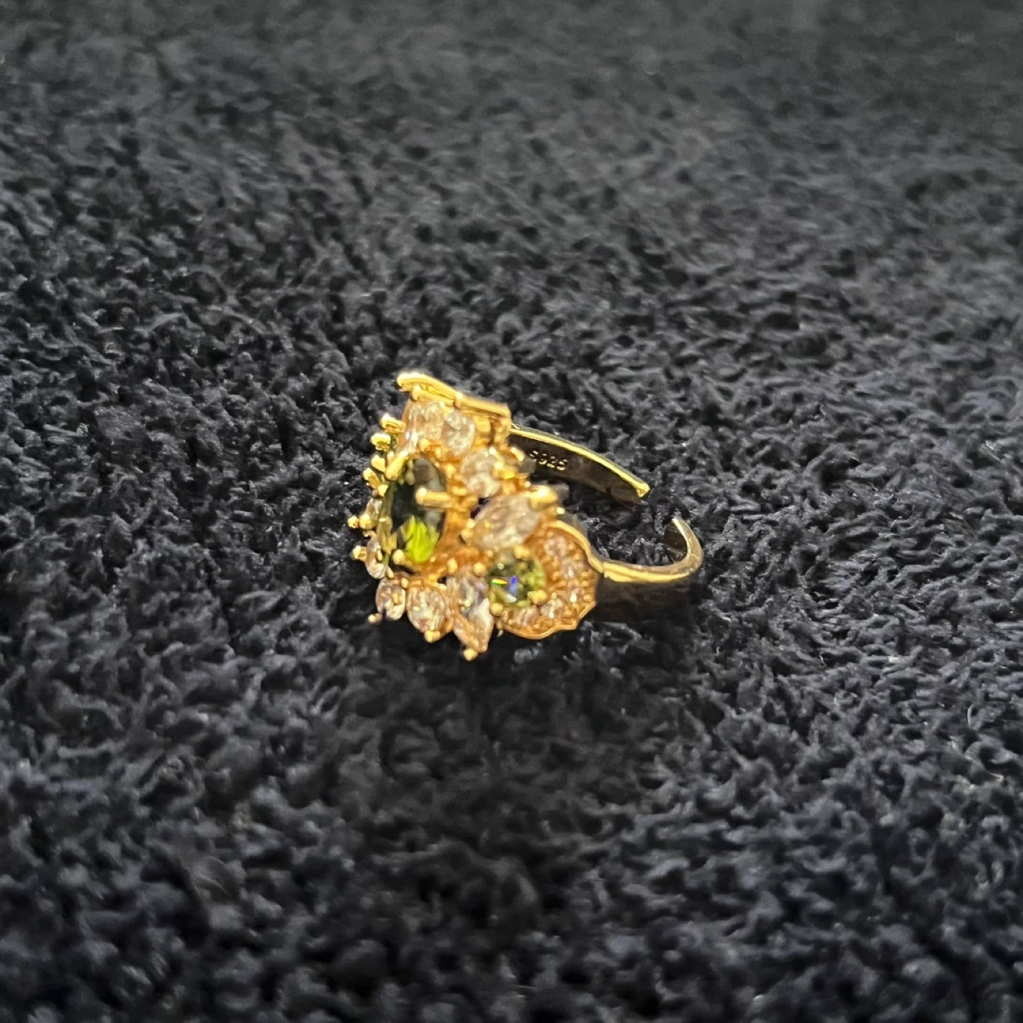 Selling a lovely gold-tone ring featuring green and white stones. It's adjustable, so it should fit most fingers nicely!