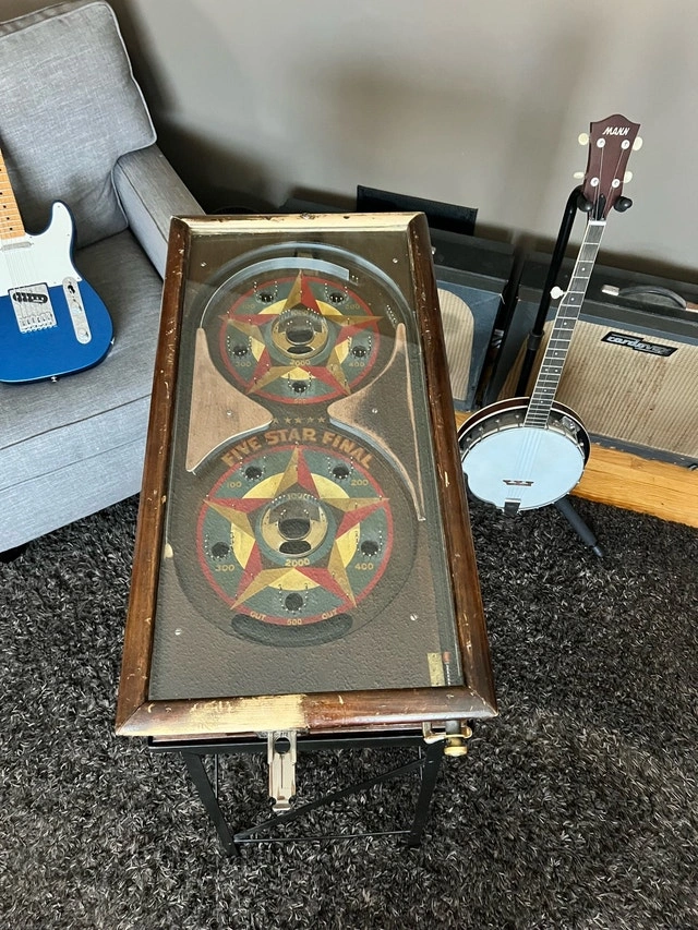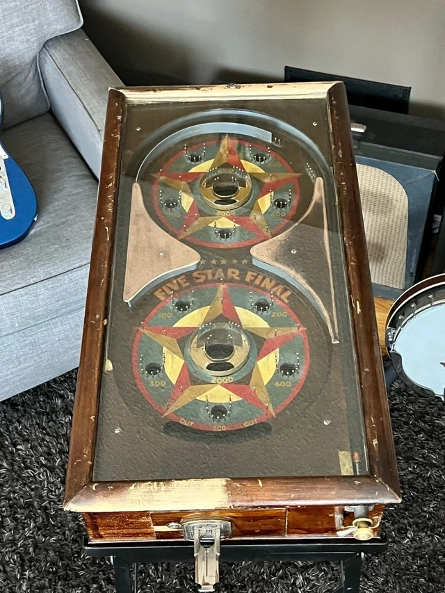 Step back in time with this Five Star Final, a true gem in the world of vintage pinball machines, produced by Gottlieb, D. & Co. in 1932. As one of the earliest pinball machines ever made, this piece is not just a game—it’s a slice of history. Features: Manufacturer: Gottlieb, D. & Co. Year of Production: 1932 Type: Non-electric pinball game with mechanical scoring. Theme: Named after the famous Broadway play “Five Star Final.” Gameplay: Skill-based manual play with original plunger and scoring system intact.