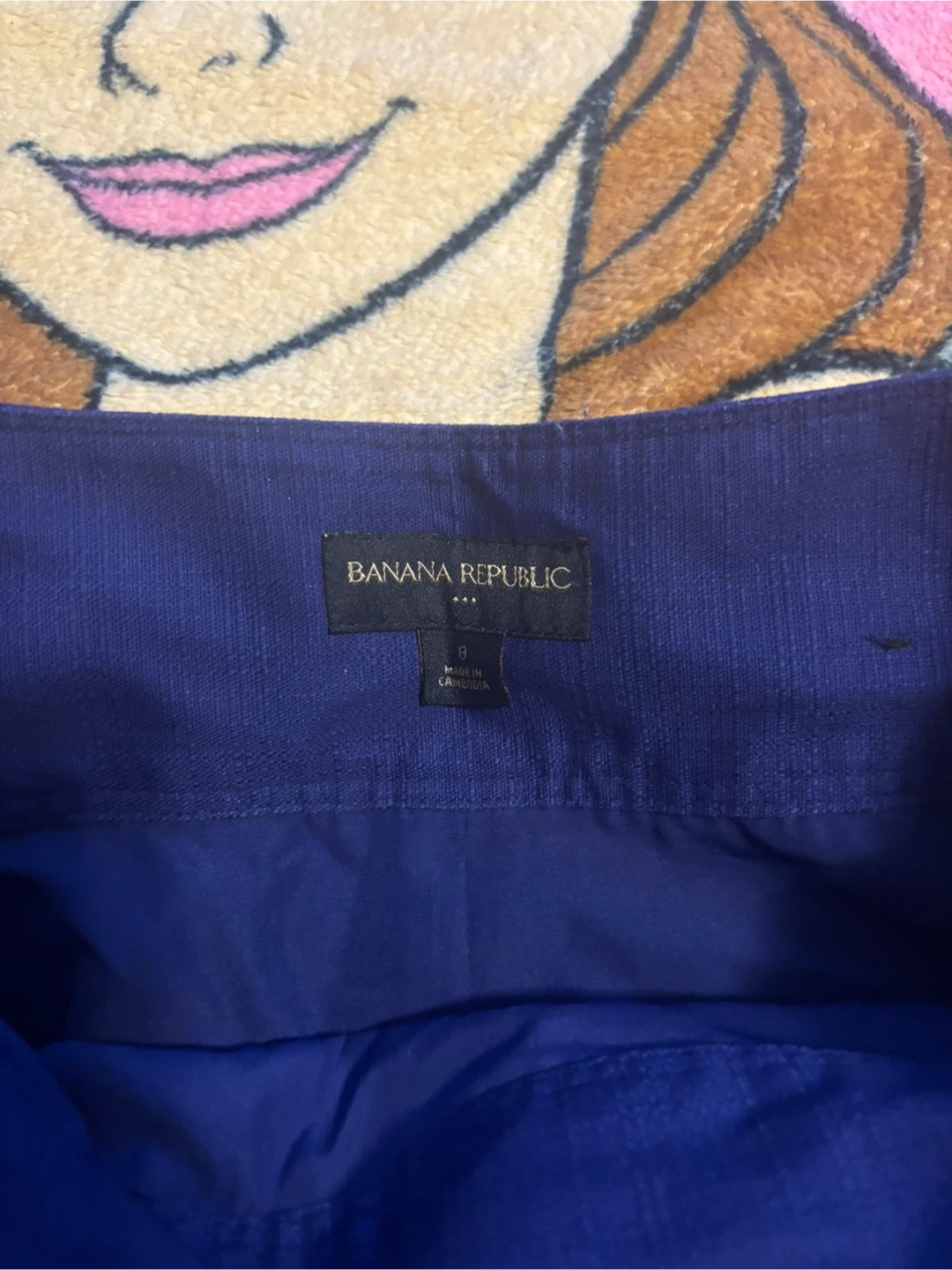 A navy blue A-line skirt from Banana Republic. It's a size 8 with a zipper closure. This skirt is made from a textured fabric.