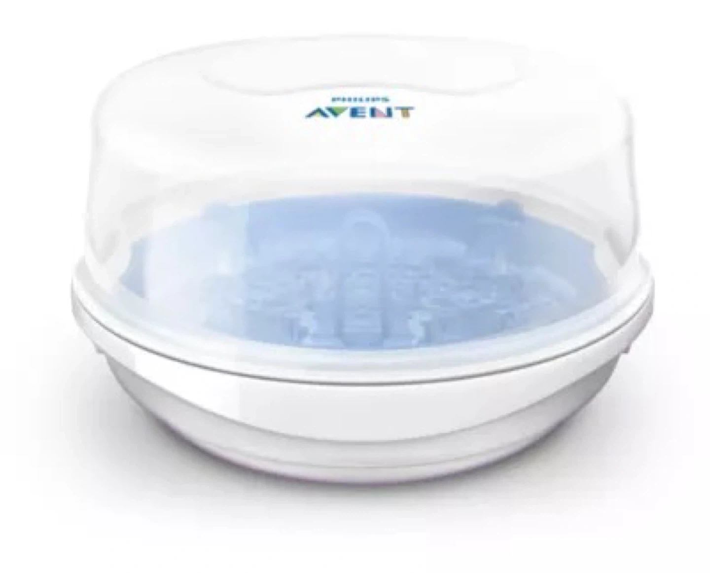 This is a Philips Avent bottle sterilizer. It's white and clear with a blue interior. It's designed for sterilizing baby bottles and accessories.