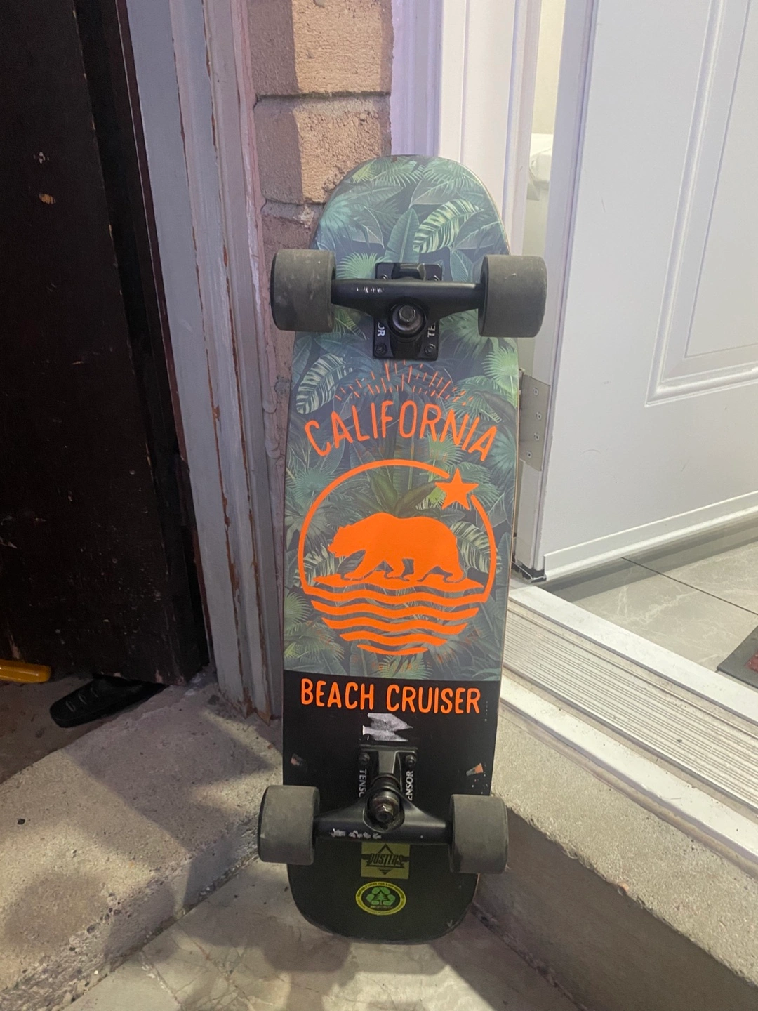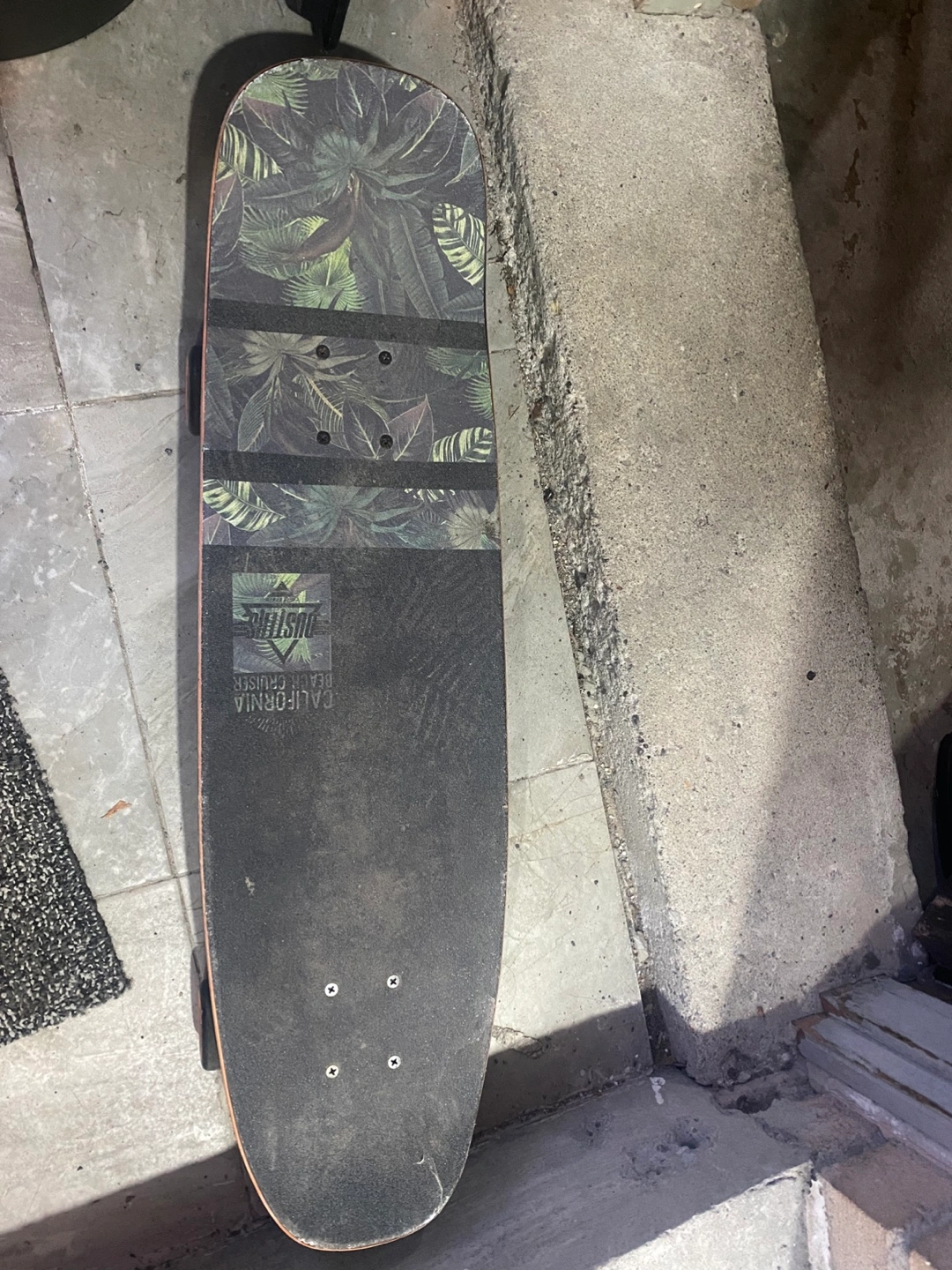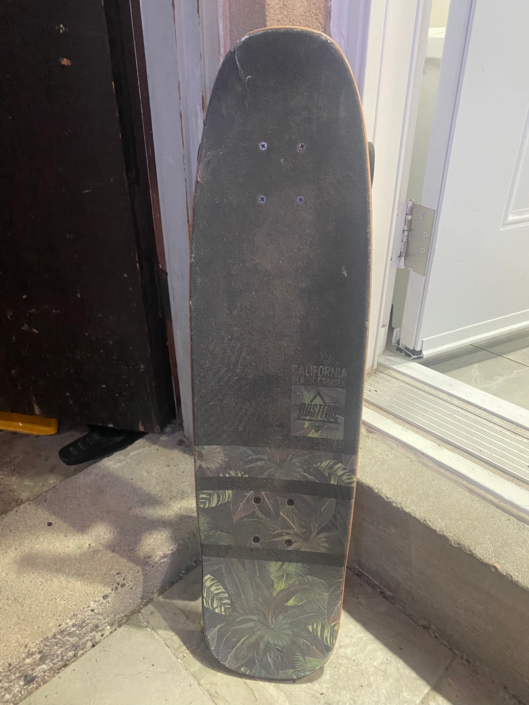Used Dusters California Beach Cruiser skateboard. Tropical leaf design. Shows some wear from use. Good condition.