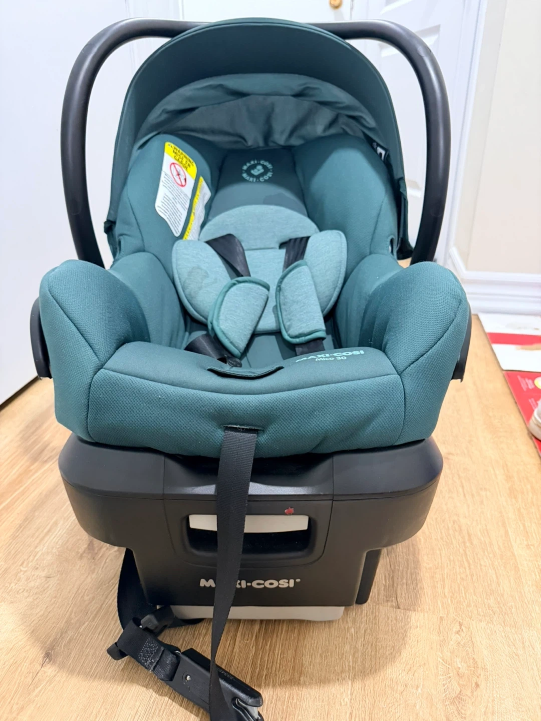 This Maxi-Cosi Mico 30 infant car seat is designed for safety and comfort. It features a plush seat with a 5-point harness for secure restraint. Teal green colour.