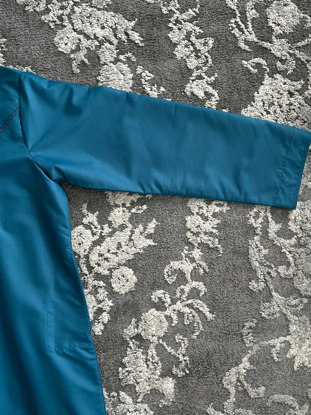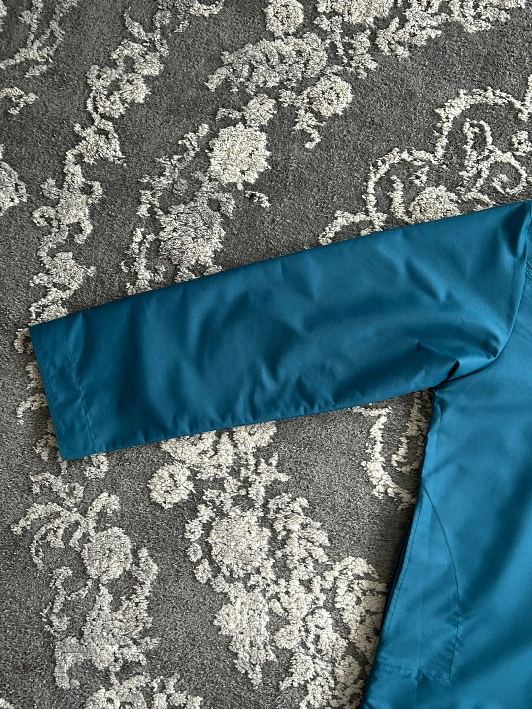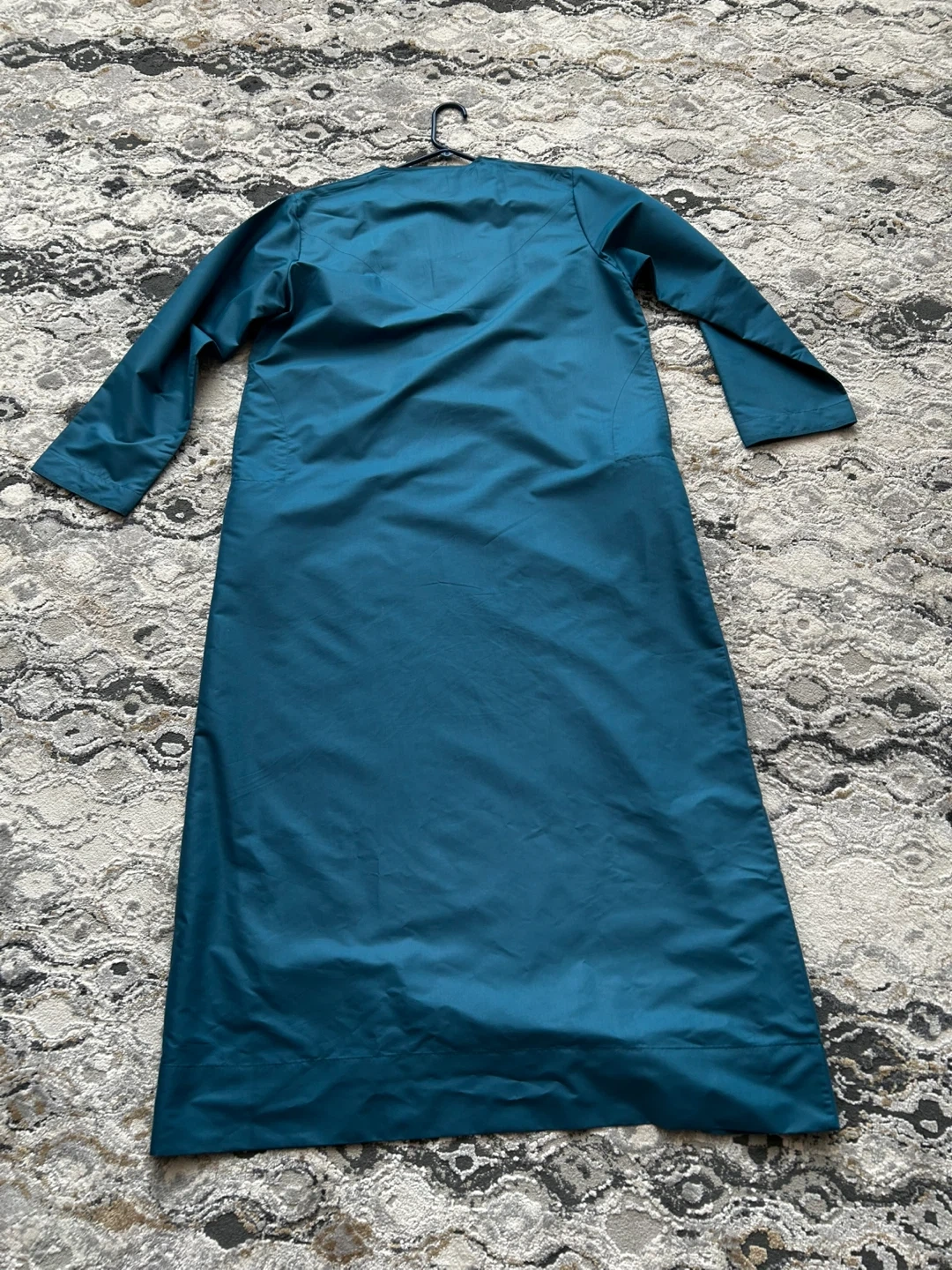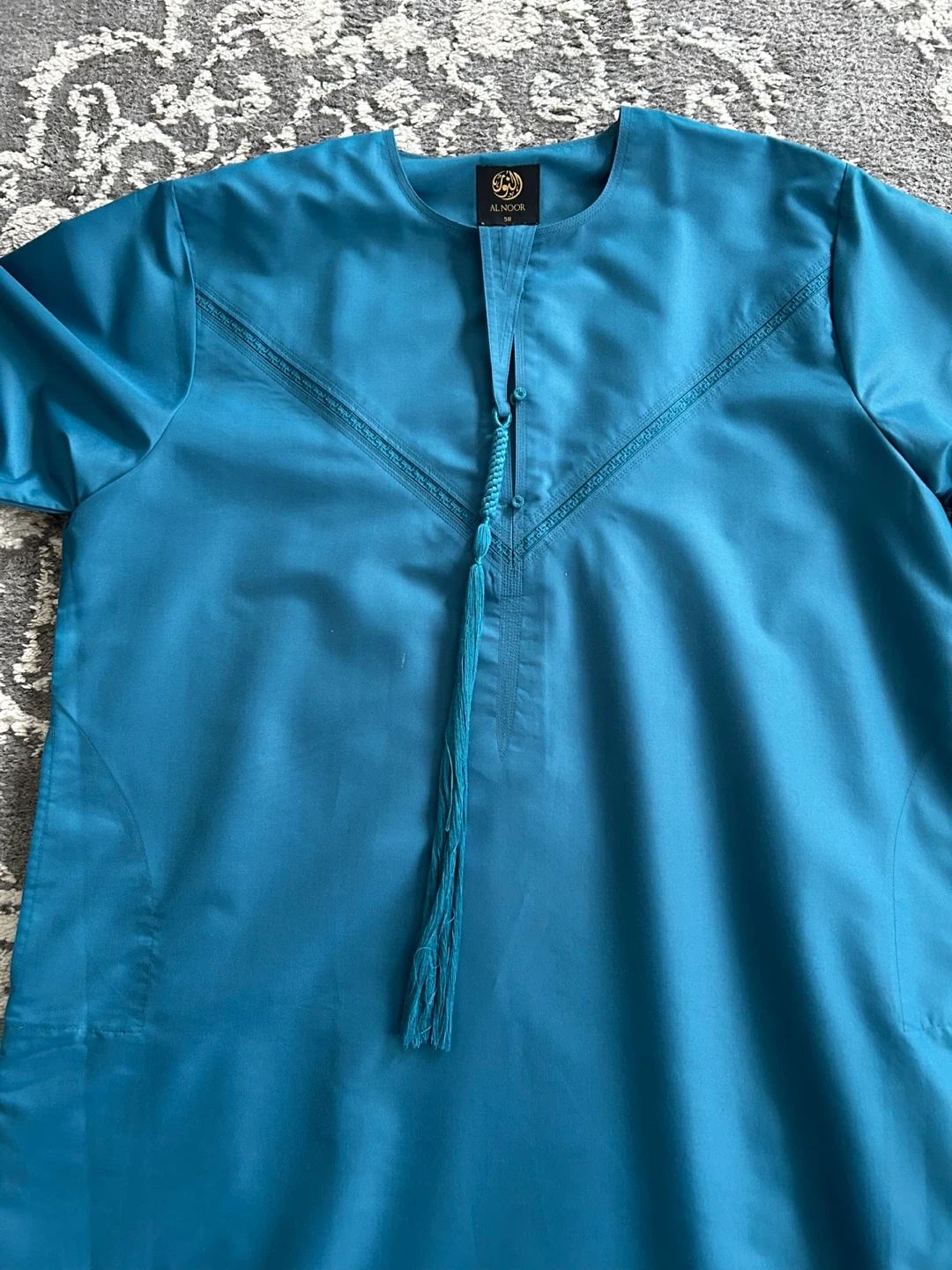 This men's thobe is a lovely teal colour. It features intricate stitching details on the chest and a decorative tassel. Made from a smooth fabric, it's perfect for formal or casual wear.