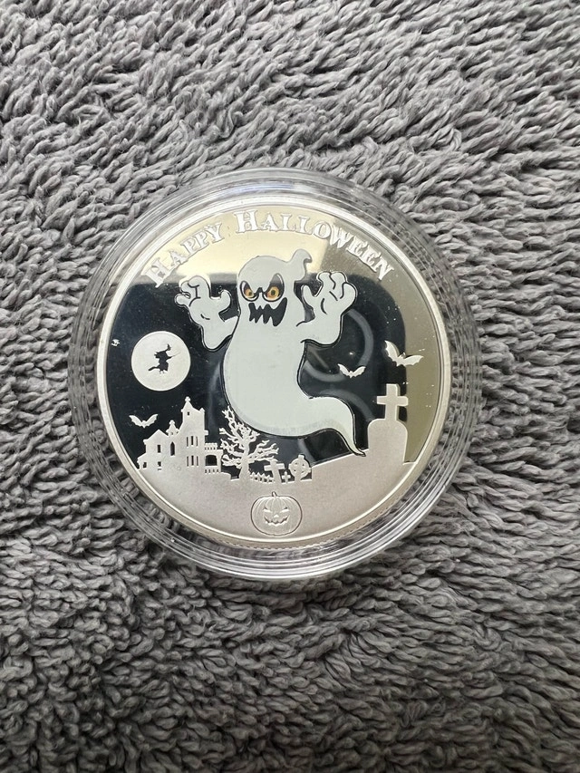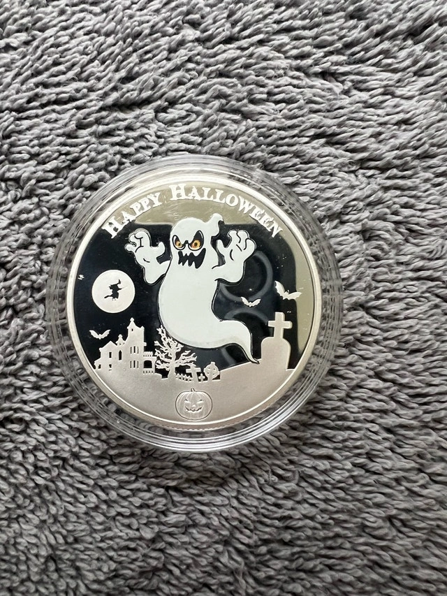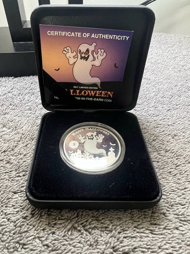 Spook up your collection with this chilling 2017 Niue .999 1oz Fine Silver Halloween Ghost Coin, a glow-in-the-dark coin! This eerie coin comes complete with a certificate of authenticity and presentation box. This coin is in good condition and is a limited edition. Year: 2017 Metal: Silver Fineness: .999 Weight: 1 oz It's so cool that it's scary! If the ad's still up, the ghost is still here!