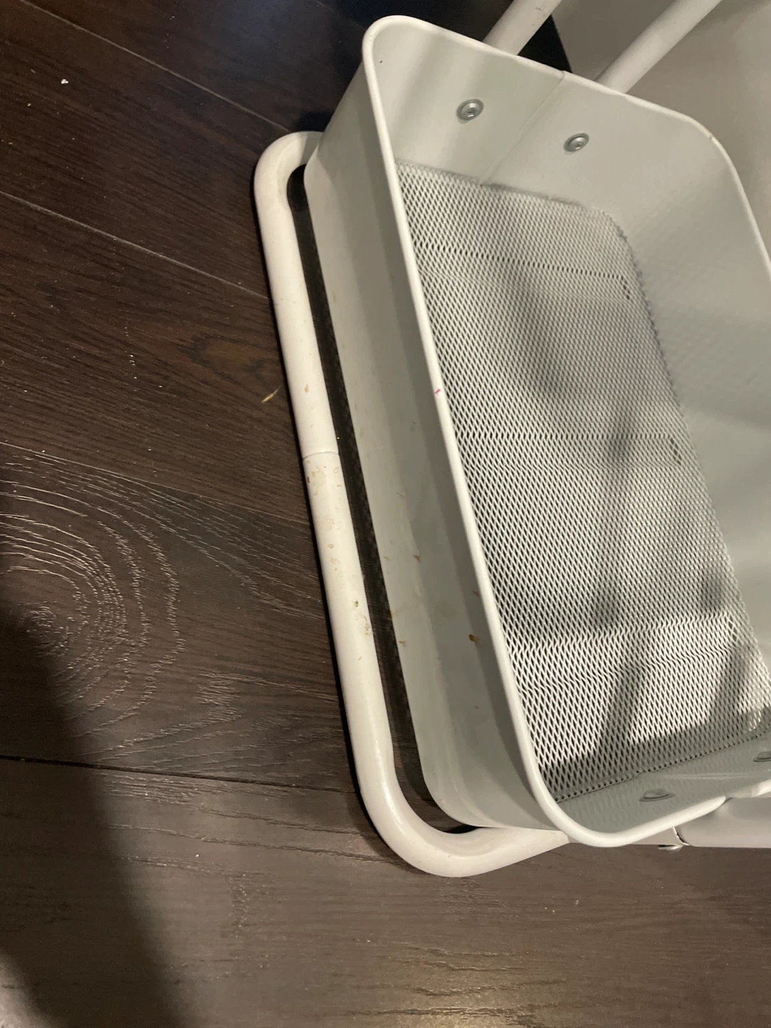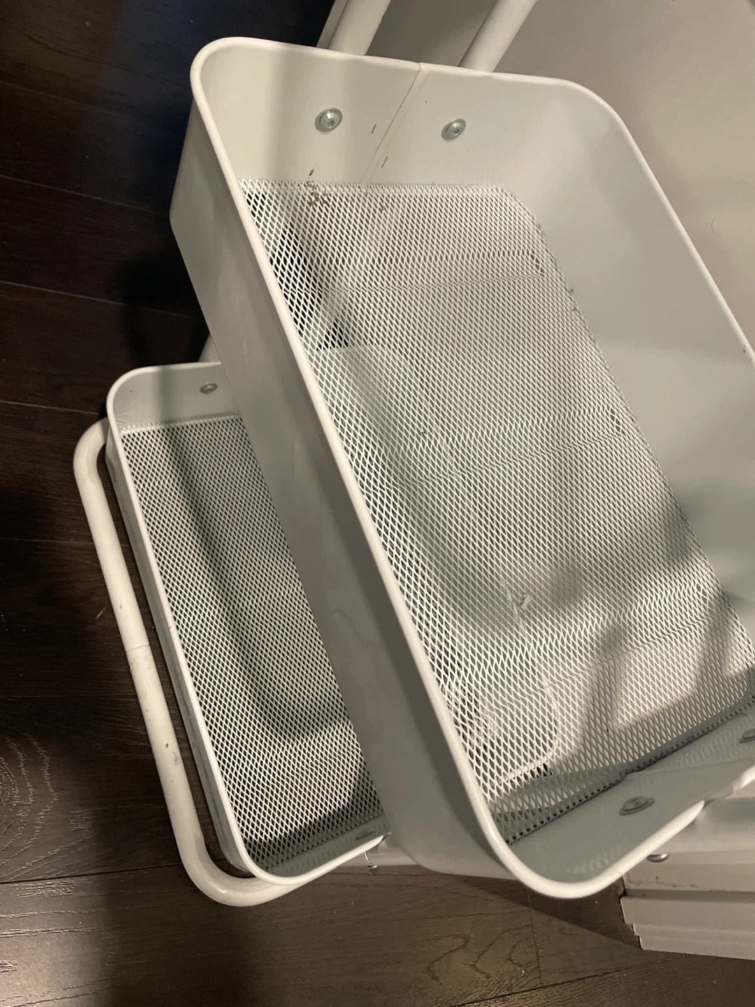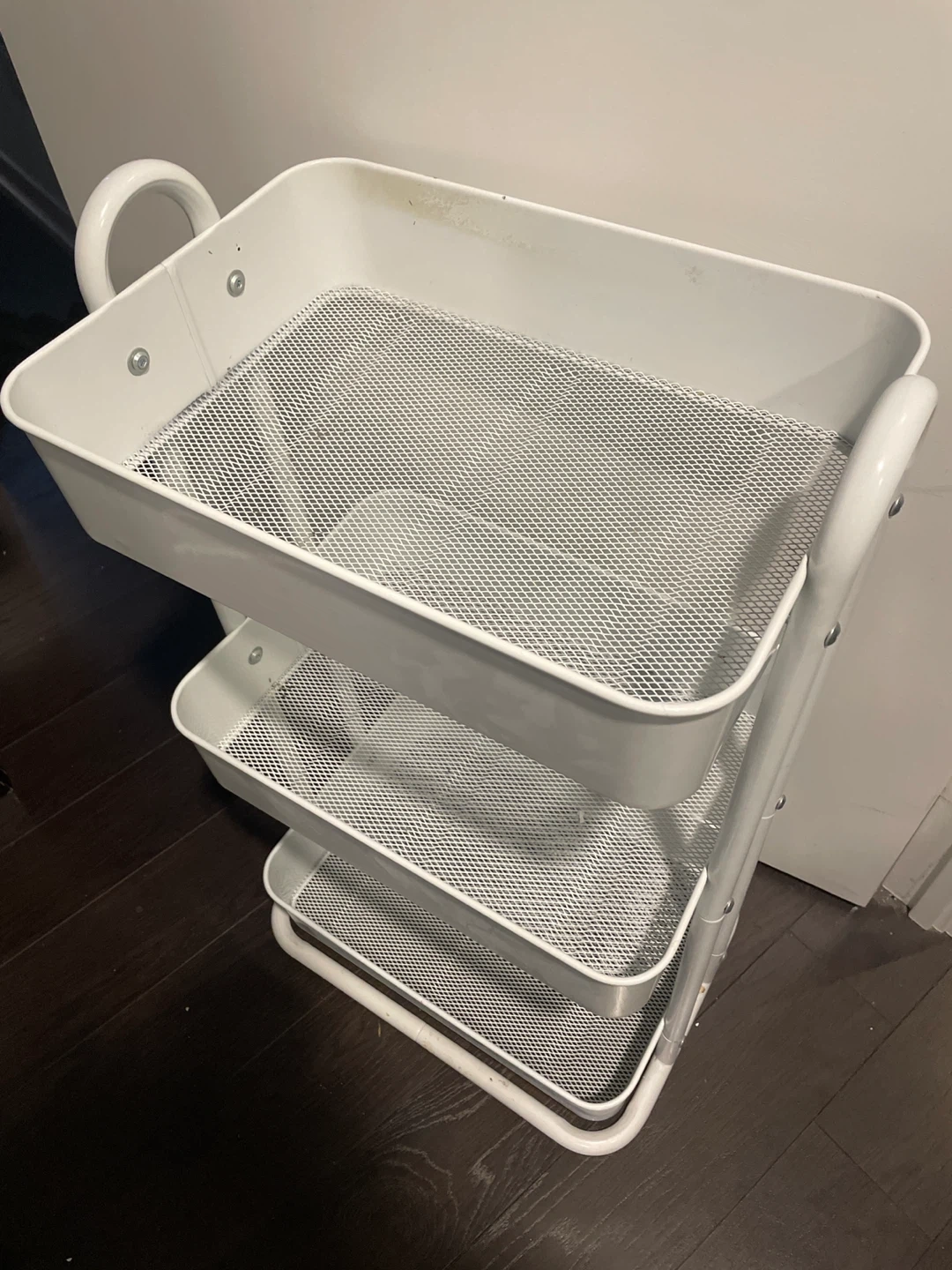 This white 3-tier storage cart offers versatile organization. It's made of metal with mesh basket shelves. The cart includes a handle. It's great for storing craft supplies, toiletries, or office essentials!