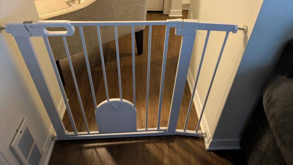 Includes a door for your cat or small dog. One gate has minor damage near the white zip tie, but it doesn't affect its function. Selling 2 for $85, or 1 for $50.