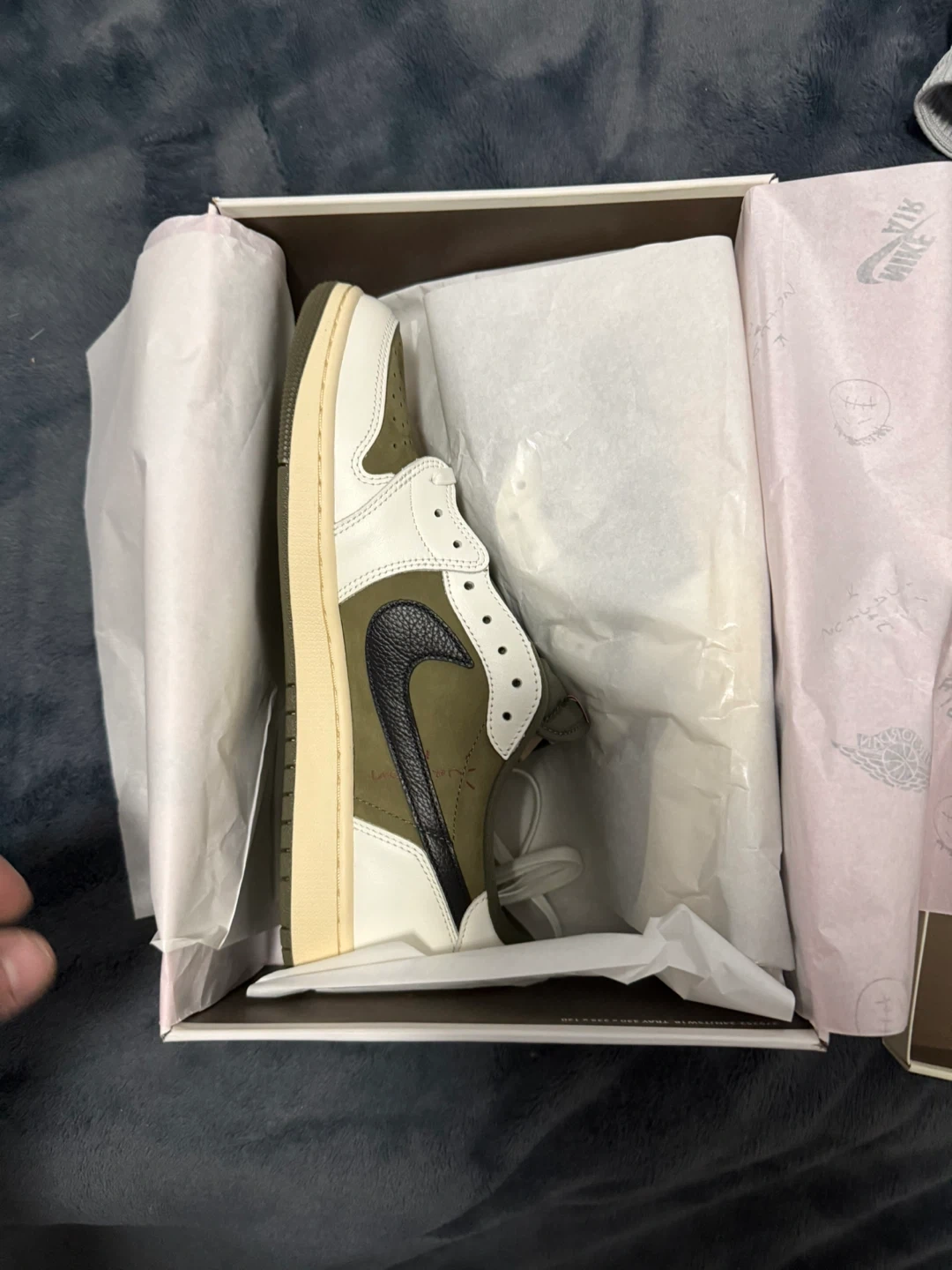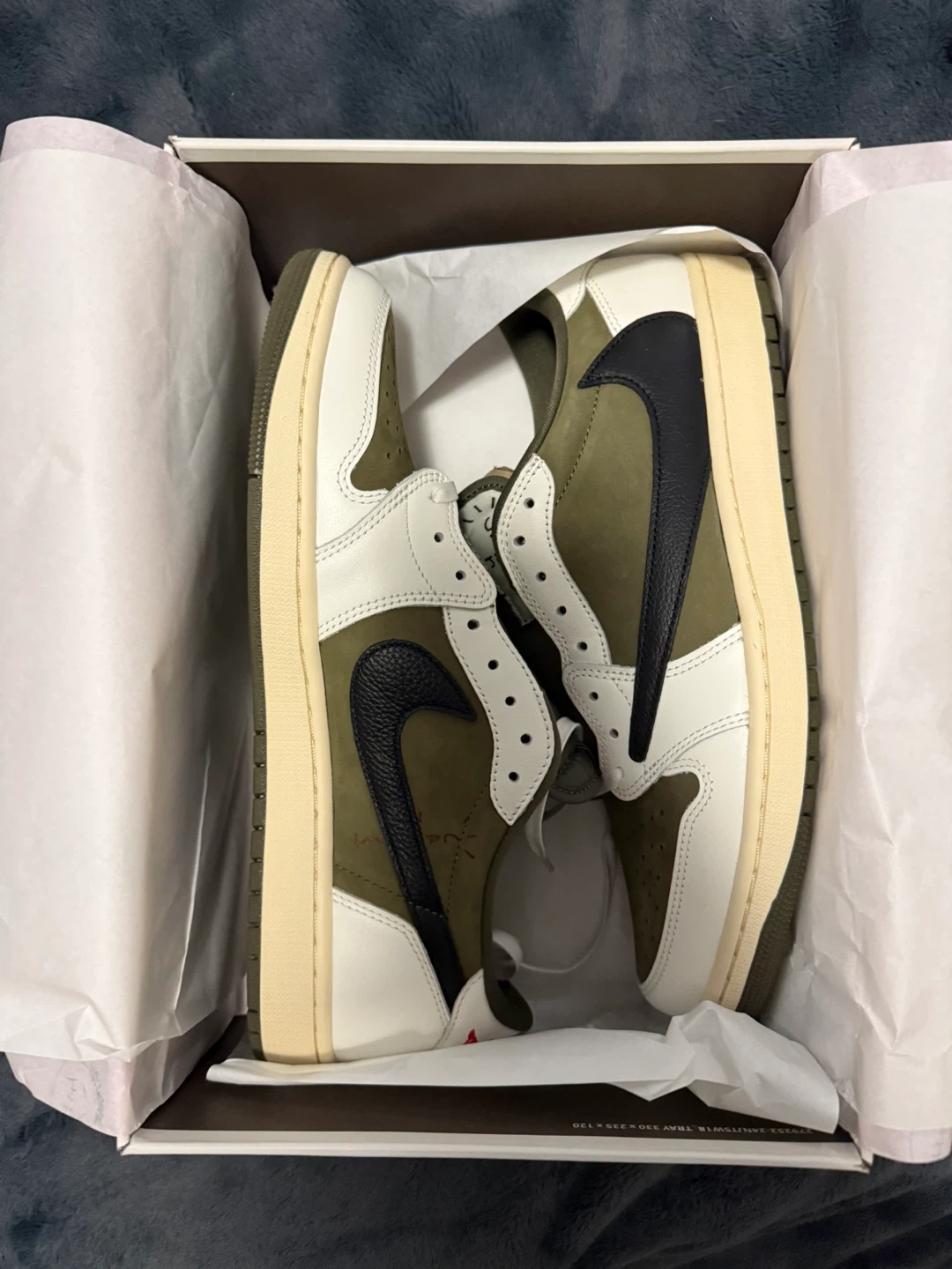 These are the Nike Air Jordan 1 Low OG SP Travis Scott sneakers in the Olive colourway. They come with their original box and packaging paper. A classic collaboration for any sneaker enthusiast!