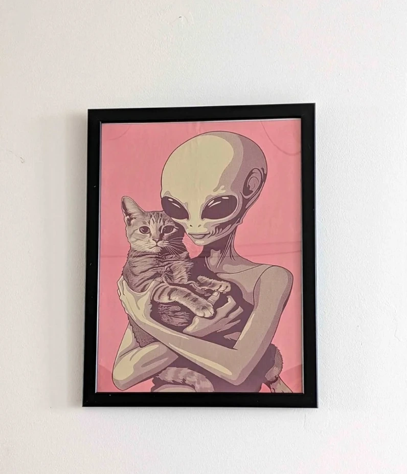 This framed print features a unique design of an alien holding a cat. It's a great conversation starter for any room. Comes in a black frame.