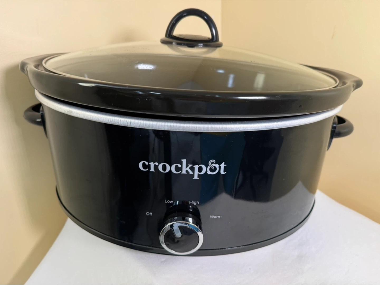 This is a Crock-Pot slow cooker. It's black and comes with a glass lid. The dial has settings for Off, Low, High, and Warm. Model SC700-B3-WM1-BR.