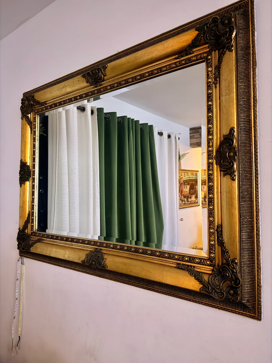 This is a decorative mirror with an ornate gold frame. It features intricate detailing along the edges. The frame's finish is gold, adding a touch of elegance. It's a statement piece for any room! Introducing our majestic antique-style ornate wall mirror, a true statement piece for your home. With a hand-applied gold leaf finish, it exudes timeless grandeur and adds a touch of opulence to any room. The bevelled glass offers a stunning reflection, while the option to hang it in both portrait and landscape orientations allows for versatile placement. Crafted with premium glass, resin, and wood materials, this mirror weighs approximately 19.2kg, ensuring sturdiness and durability. Hang it securely with the provided D-Ring fixing and let this exquisite mirror become the centerpiece of your decor.
