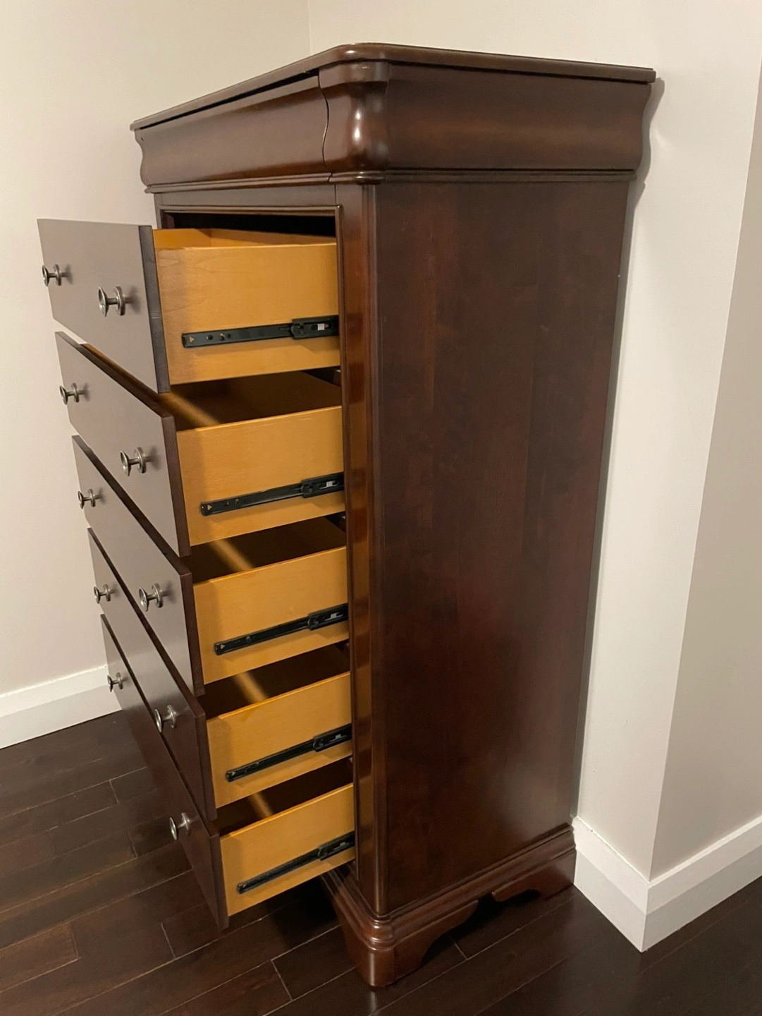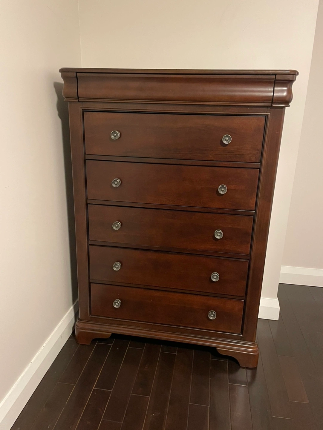 Dark brown wood finish. Five drawers with metal hardware. Solid wood construction. Good condition
