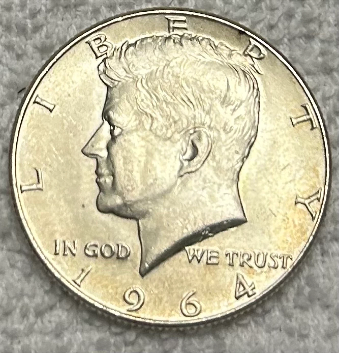 This is a 1964 Kennedy half dollar coin, minted in the United States. It's made of .90% silver. This coin was the first year of issue for the Kennedy half dollar. It's a piece of American numismatic history!