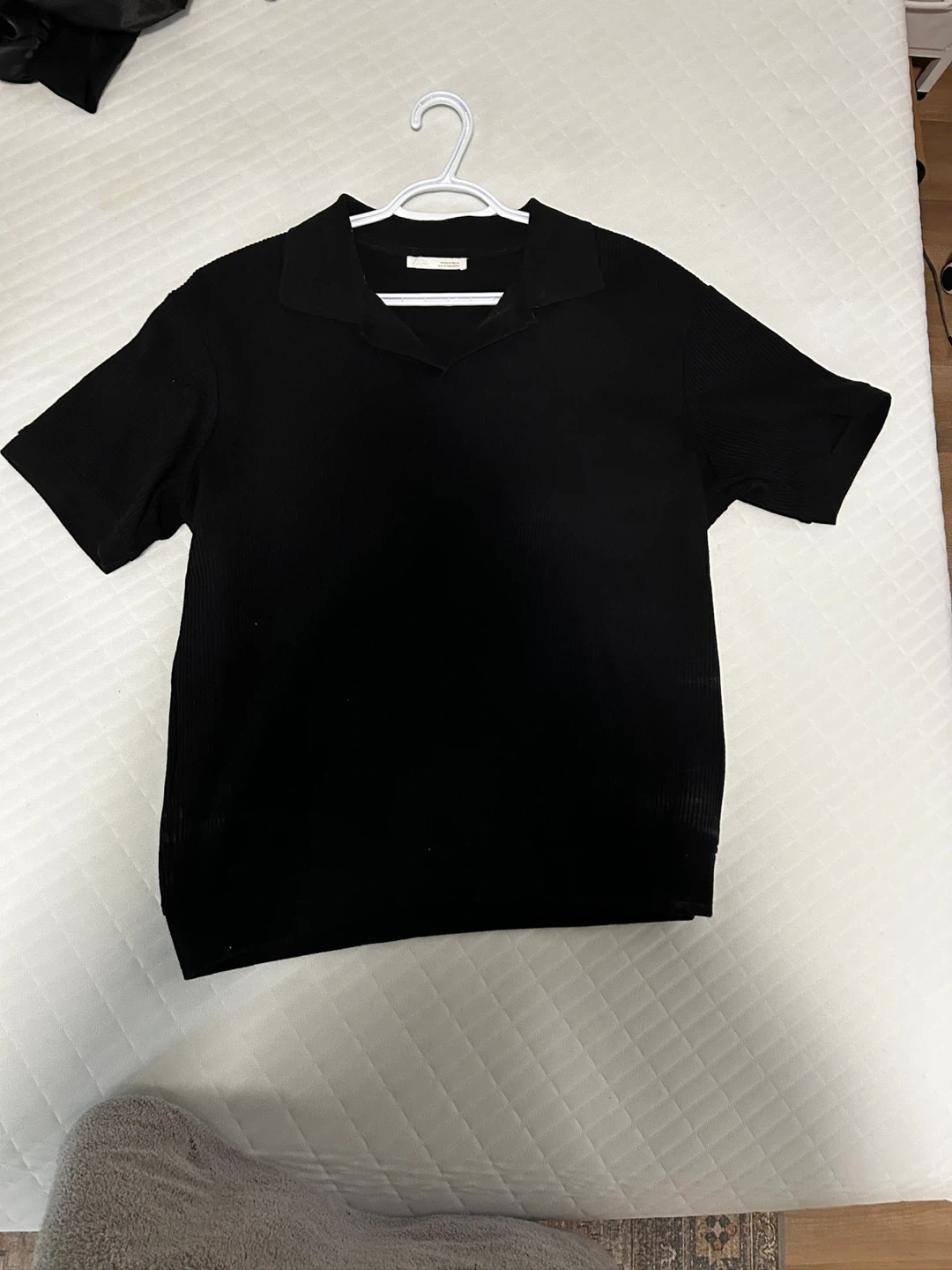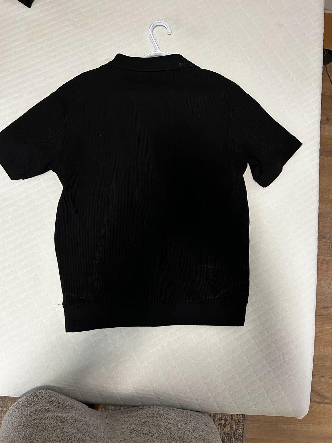 This is a black short-sleeved collared shirt from Zara. It's a size medium and made with a ribbed fabric. The shirt was made in Bangladesh.