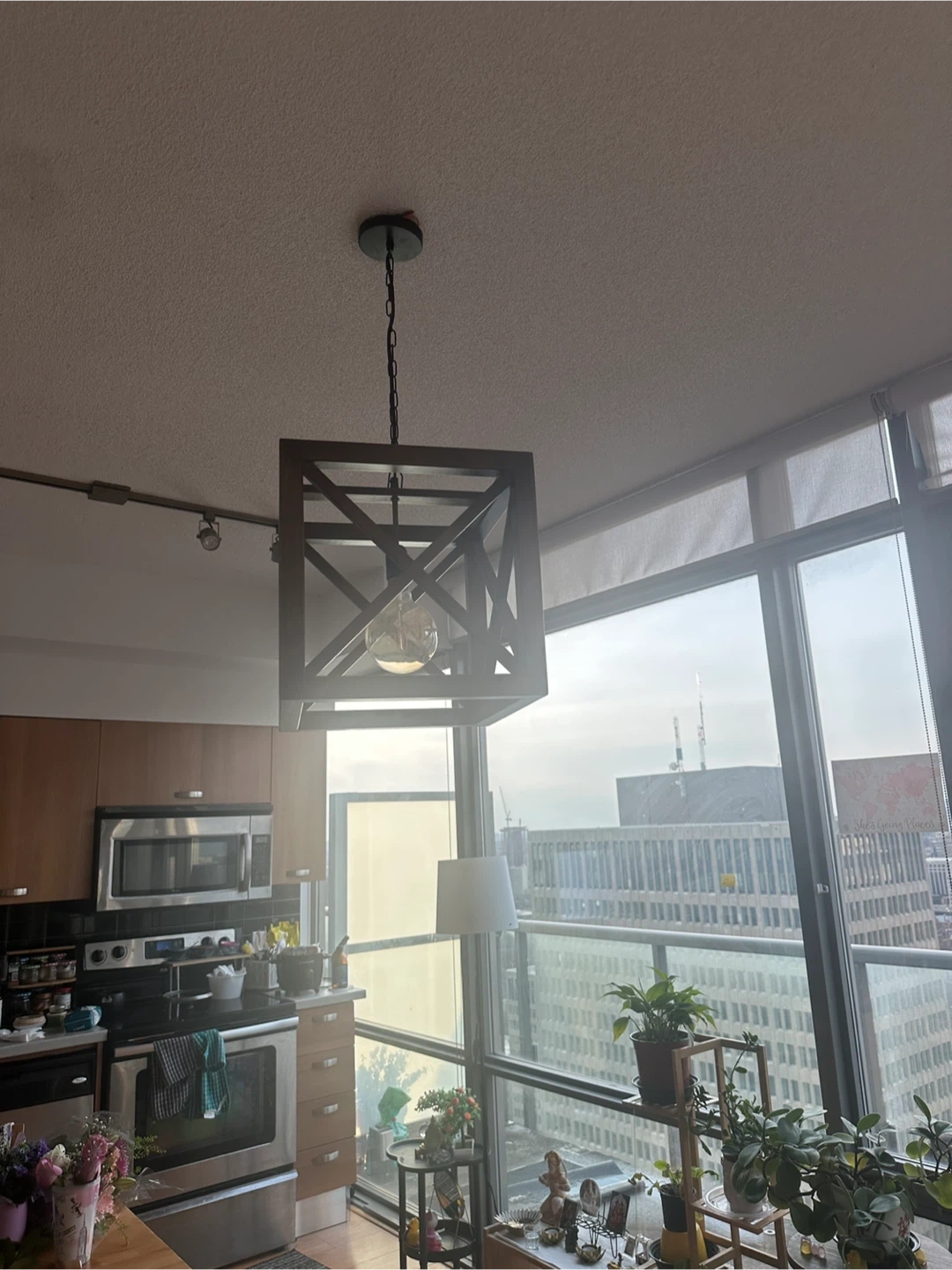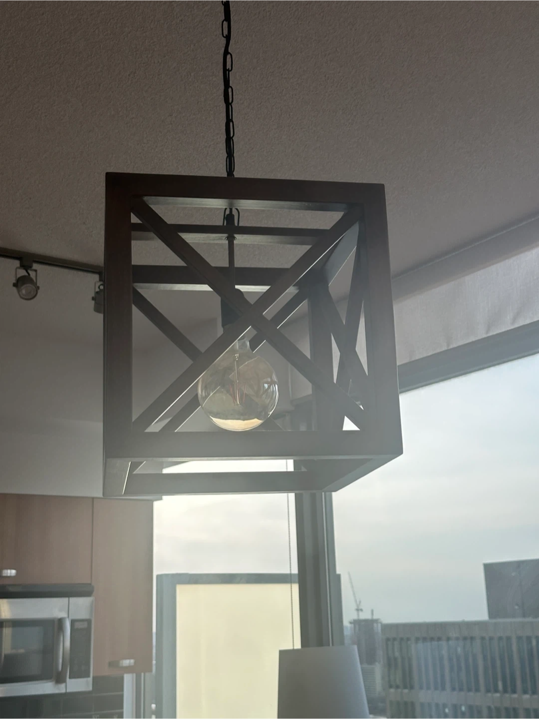 This pendant light features a unique open wood cube design with a rustic finish. It's perfect for adding a touch of industrial charm to any room. The light fixture hangs from a metal chain and includes a visible Edison-style bulb.