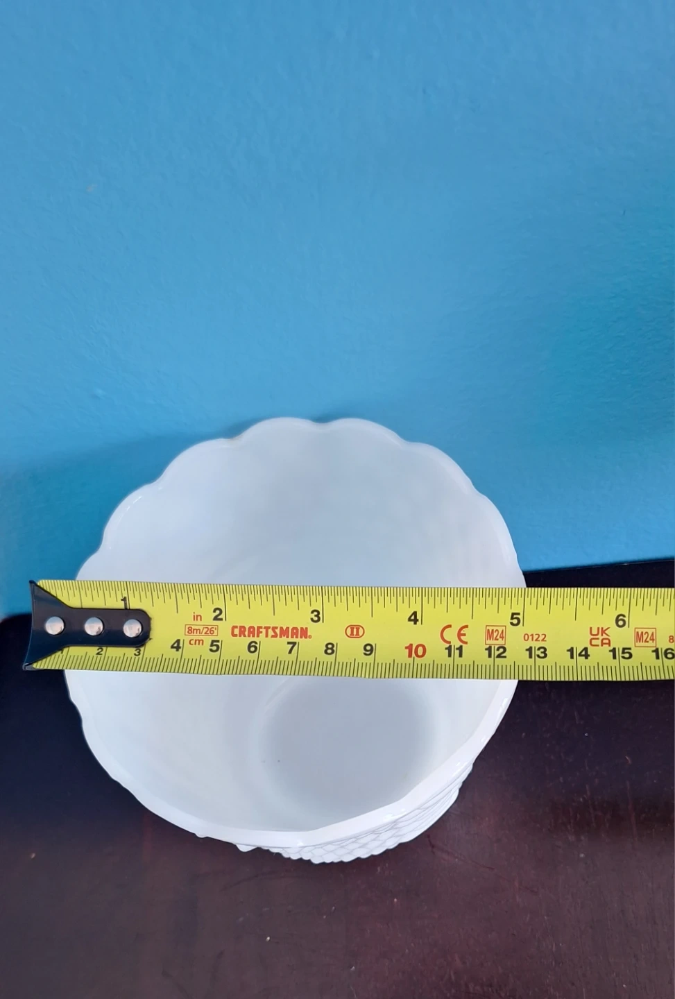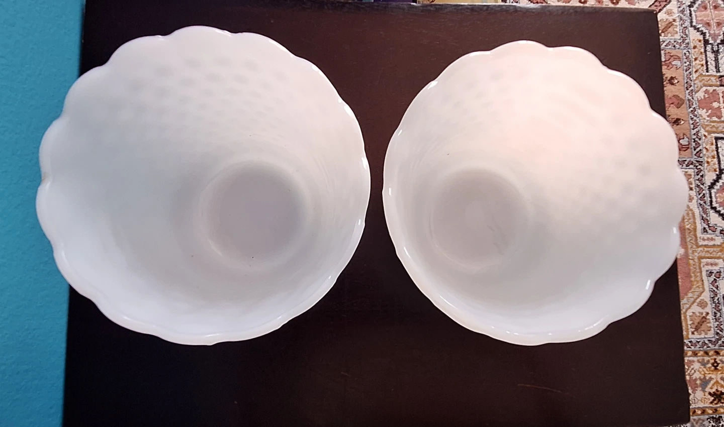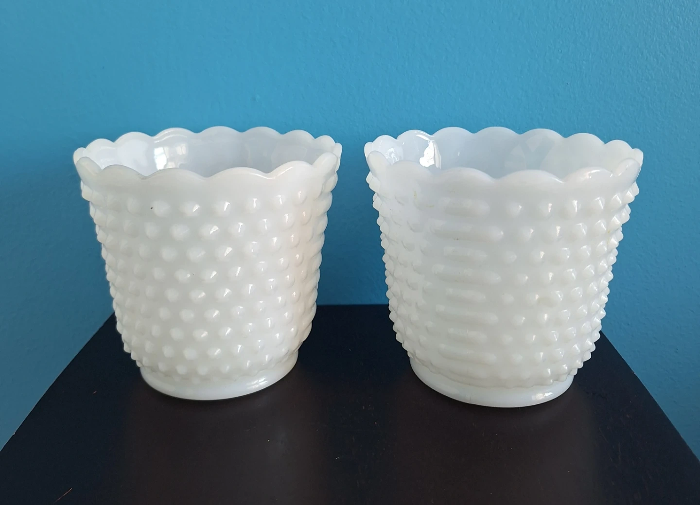 This is a set of two white milk glass planters. They have a hobnail pattern and a scalloped rim. Made in USA by Anchor Hocking in 1960s