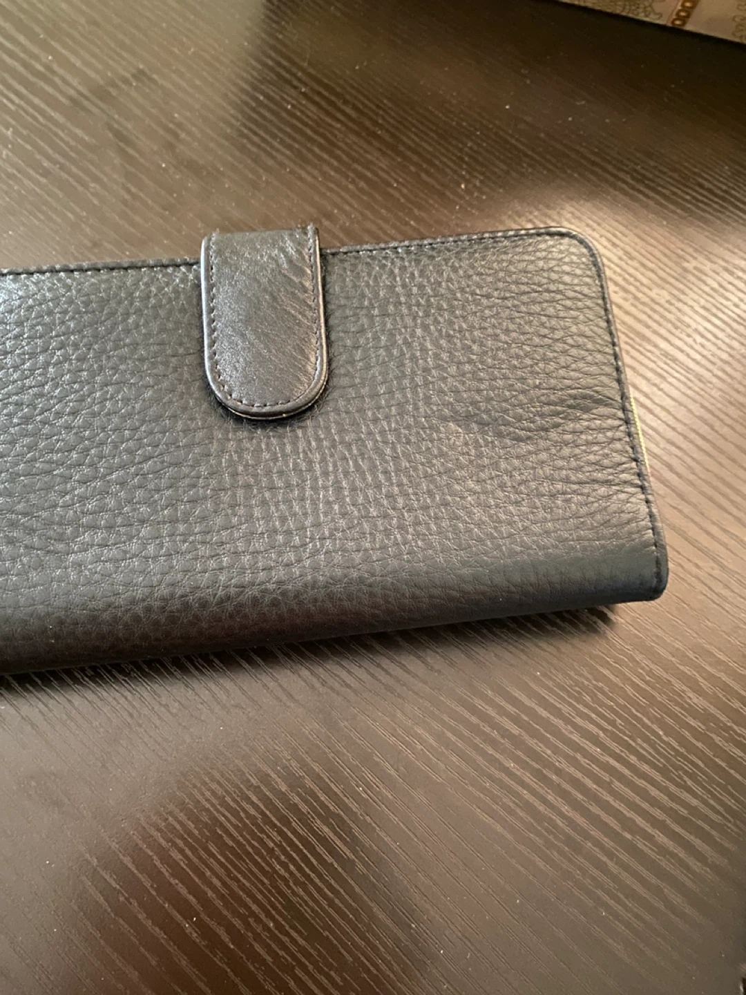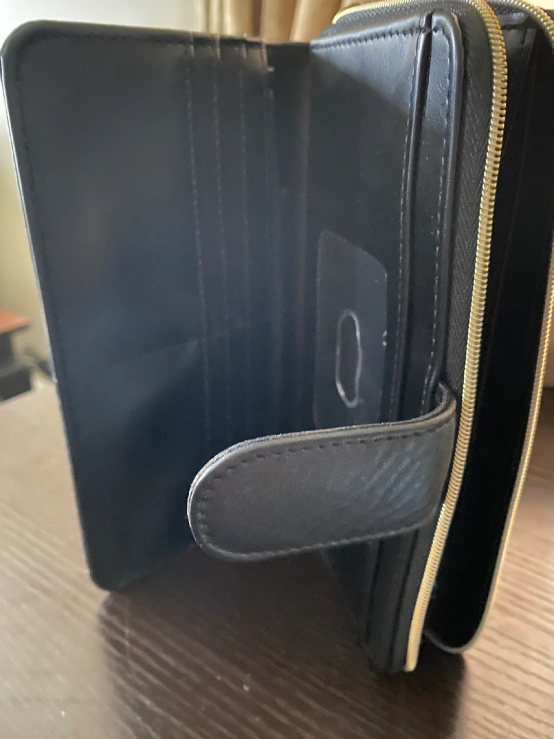This Burton zip-around wallet is made from genuine black leather. It features multiple card slots and a zippered coin pocket. It's a classic and functional accessory for organizing your essentials.