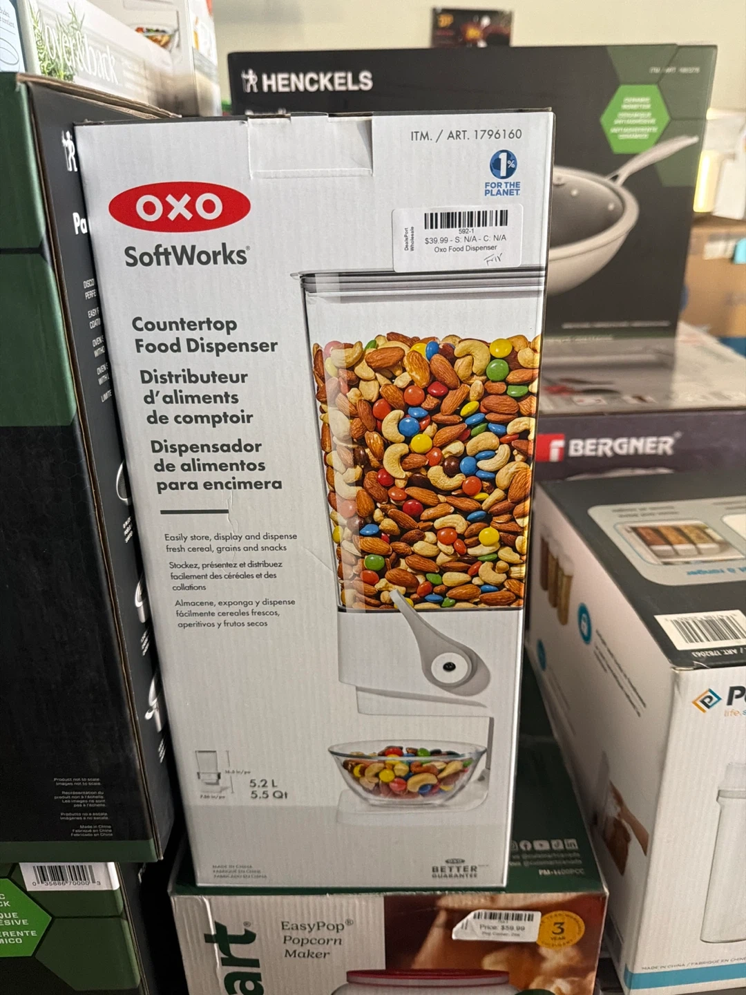 The countertop food dispenser from OXO is ideal for keeping cereals and snacks fresh and handy. The spring-loaded levers allow for controlled, one-handed dispensing while the chute-design opening won't crush food as it dispenses. The large 5.5-liter capacity is great for storing cereal, pretzels, trail mix and even pet food!