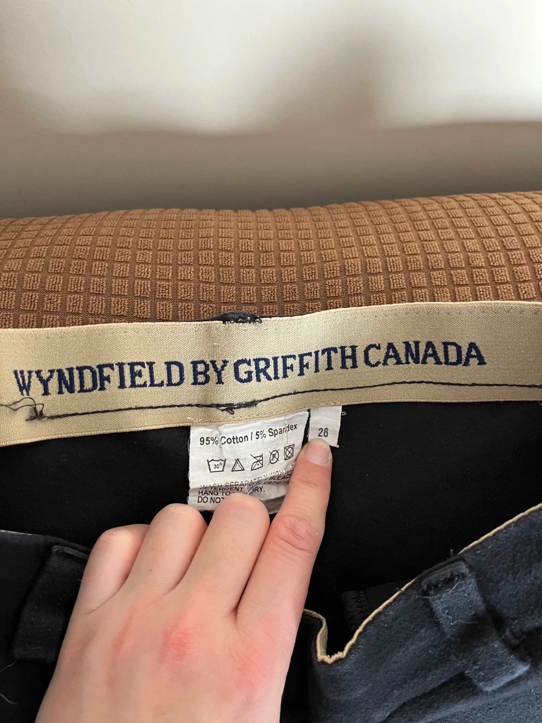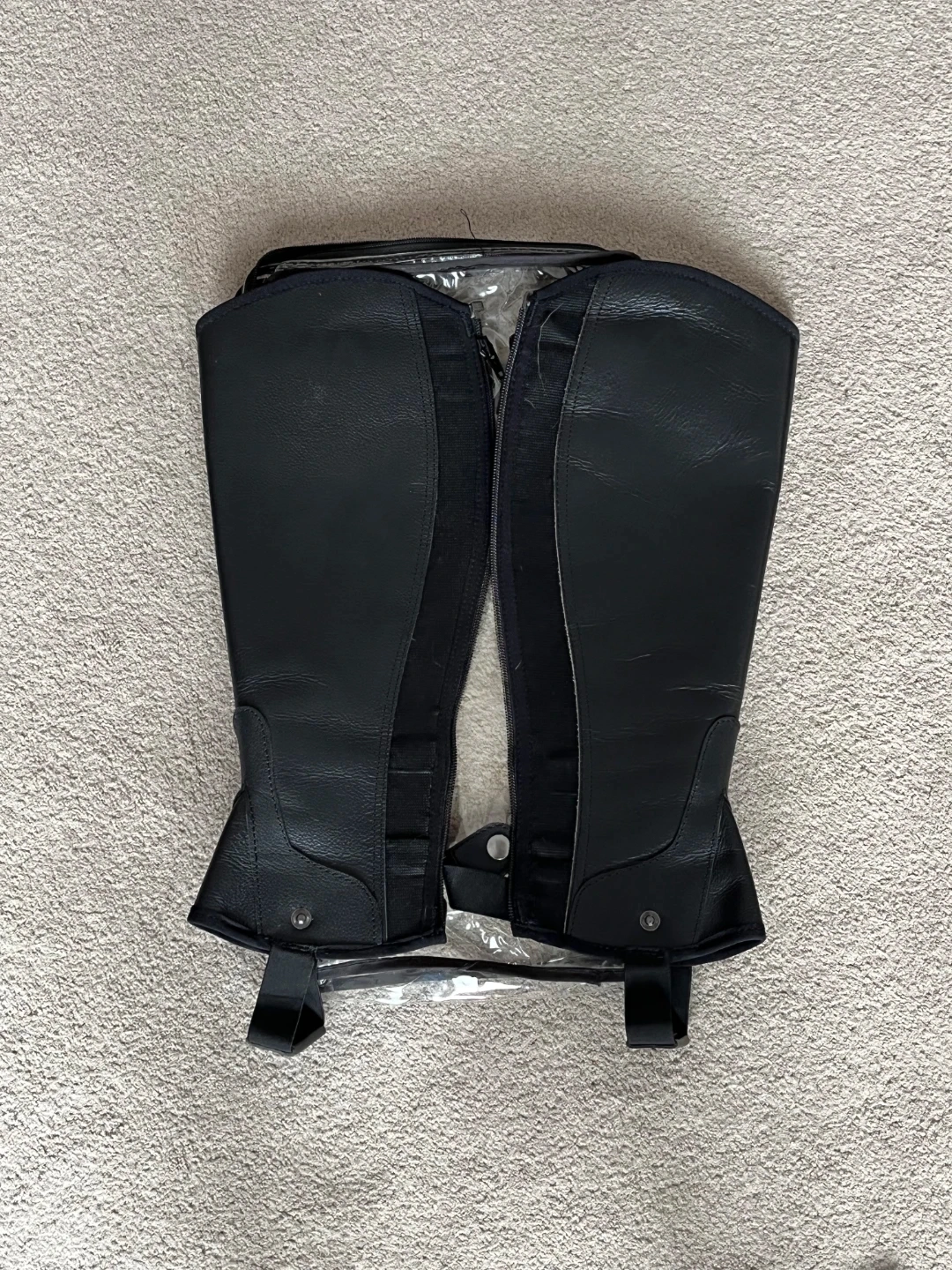 Bundle of four pairs of riding breeches and one pair of black leather chaps. Two pairs of Elation breeches in tan and grey, size 32R. One pair of Wyndfield by Griffith Canada breeches, size 28. One pair of black riding pants, size 28. Black leather chaps included.