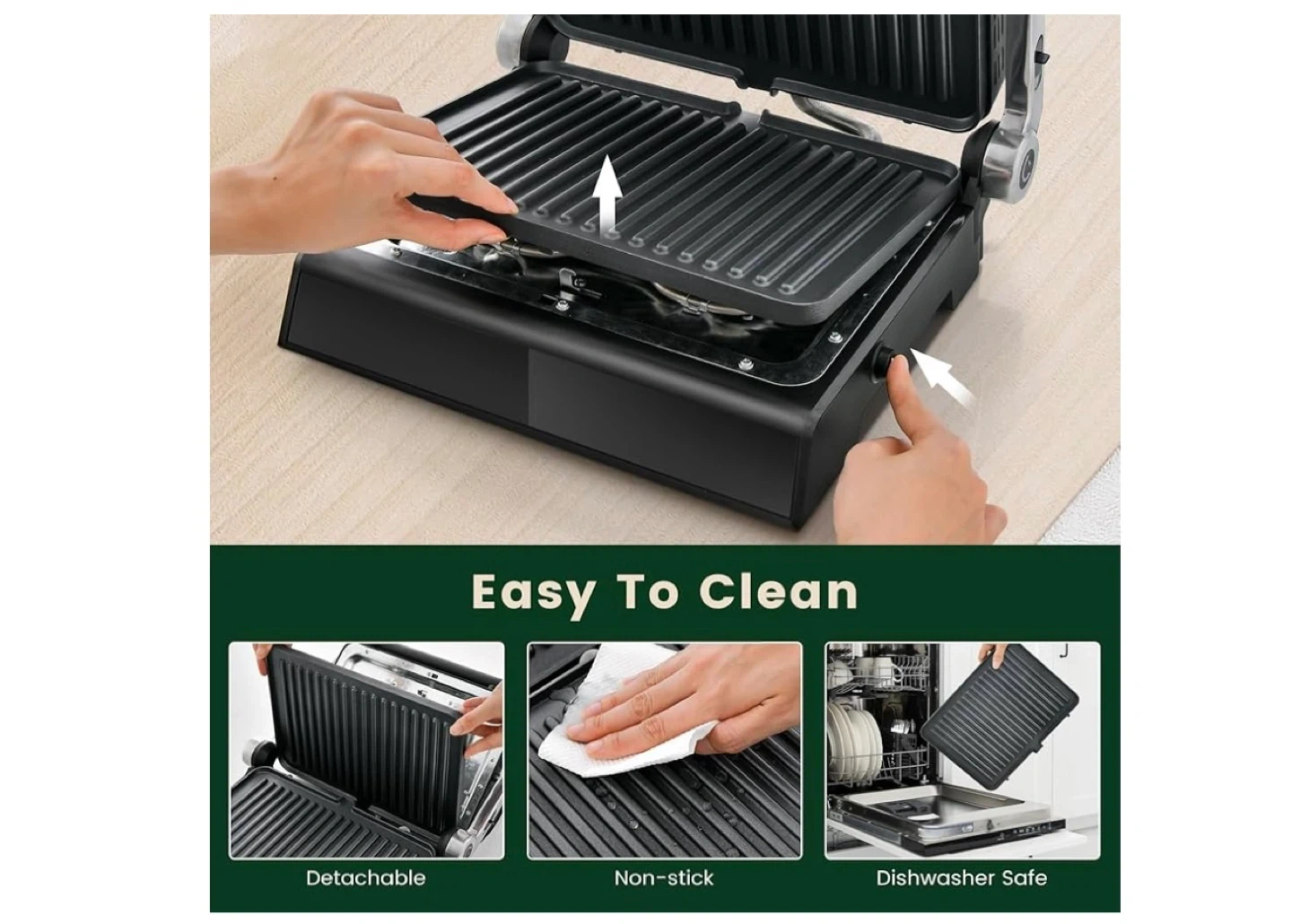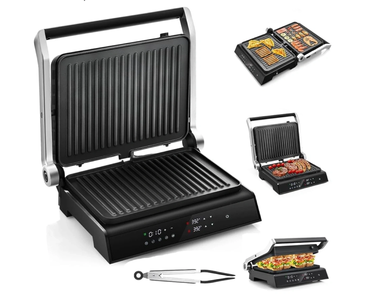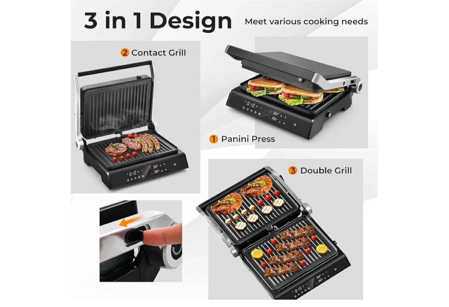 This 3-in-1 electric grill offers contact grill, panini press, and double grill functions. It features a floating hinge lid, detachable non-stick plates, and a dishwasher-safe design for easy cleanup. The LED touch control panel has 5 auto cooking modes for vegetables, sausage, fish, chicken, and beef steak.