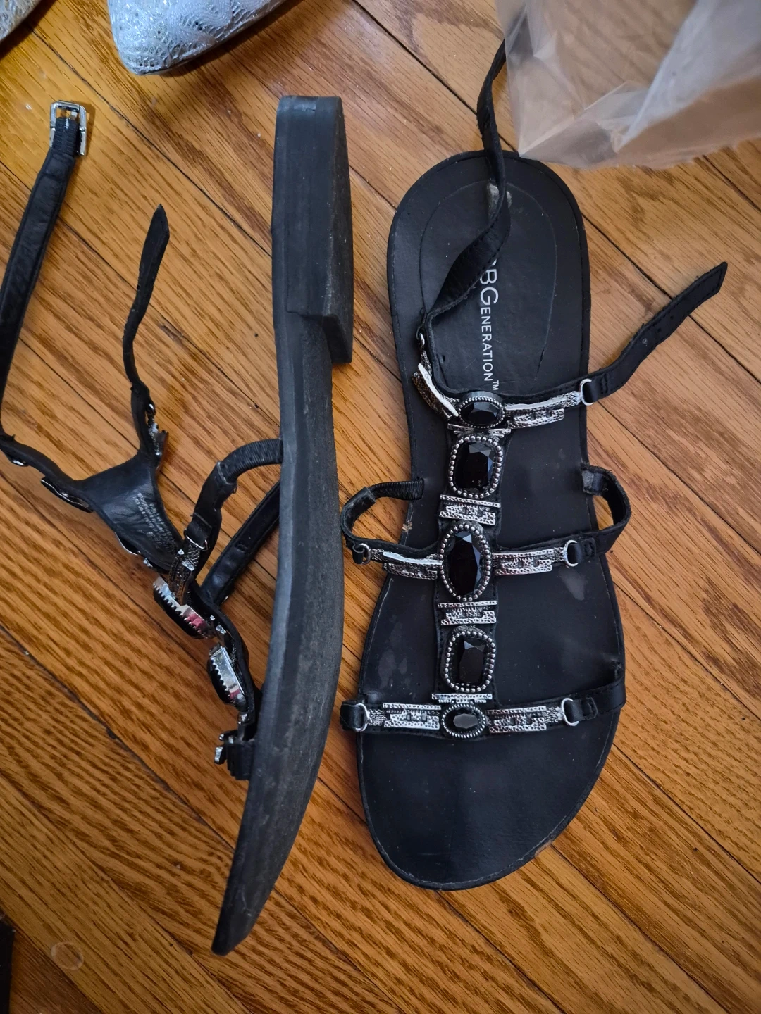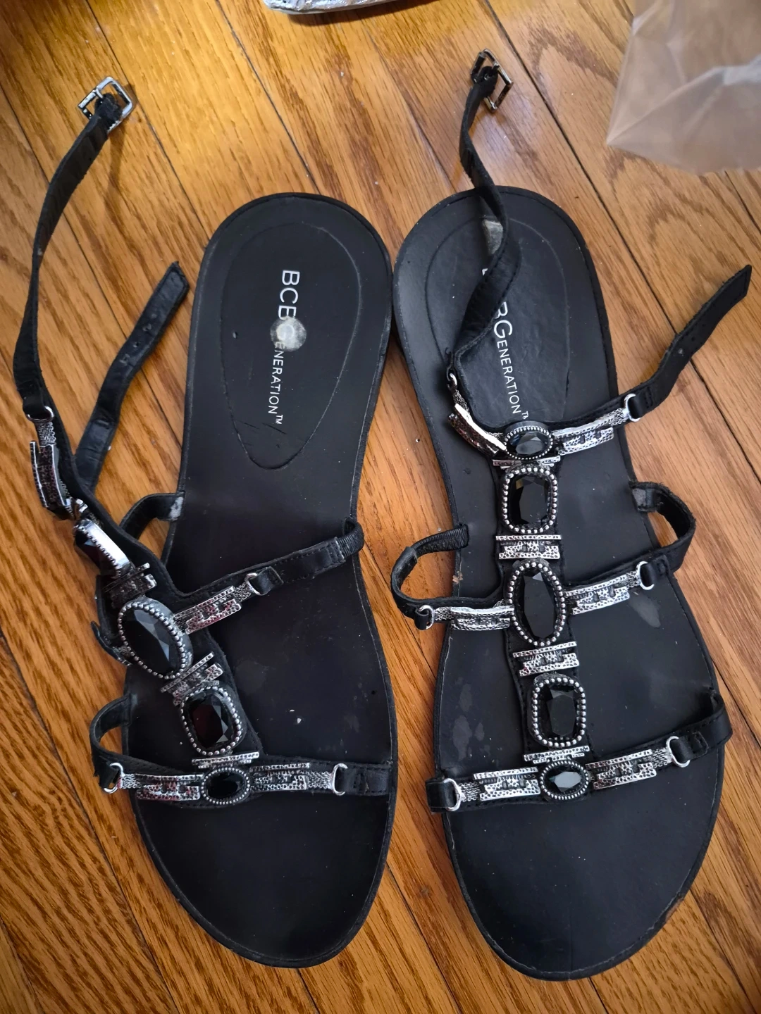 These BCBGeneration sandals are in a sleek black colour and feature beautiful embellishments. Are a little worn out in the front.