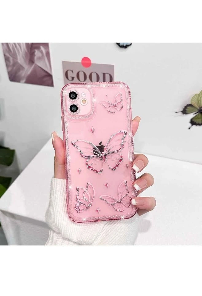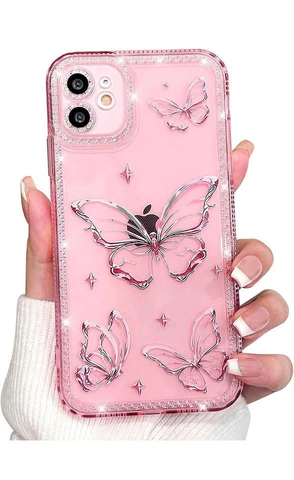 Cute clear case for iPhone 11 with a glitter butterfly design and shiny stars. Sparkly bling with diamond rhinestones. Soft TPU material provides shockproof protection. Pink color.