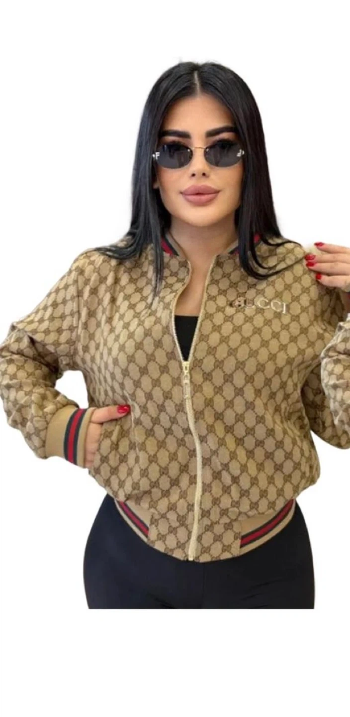 A stylish Gucci track jacket featuring the iconic monogram pattern. It's made with a comfortable fabric and has ribbed cuffs and hem with signature stripe detailing. It includes a full zip closure.
