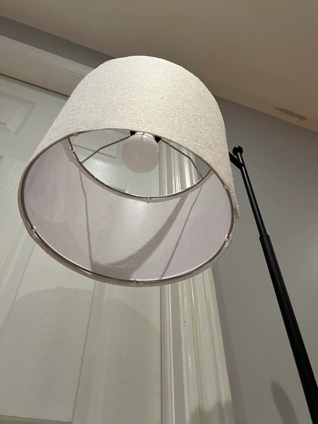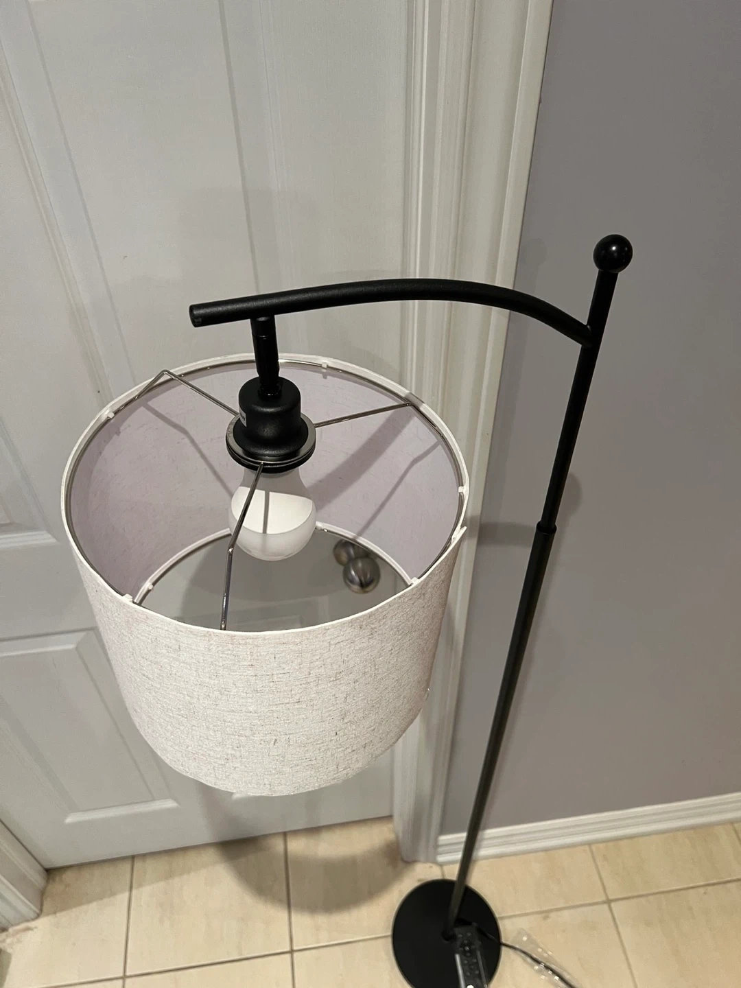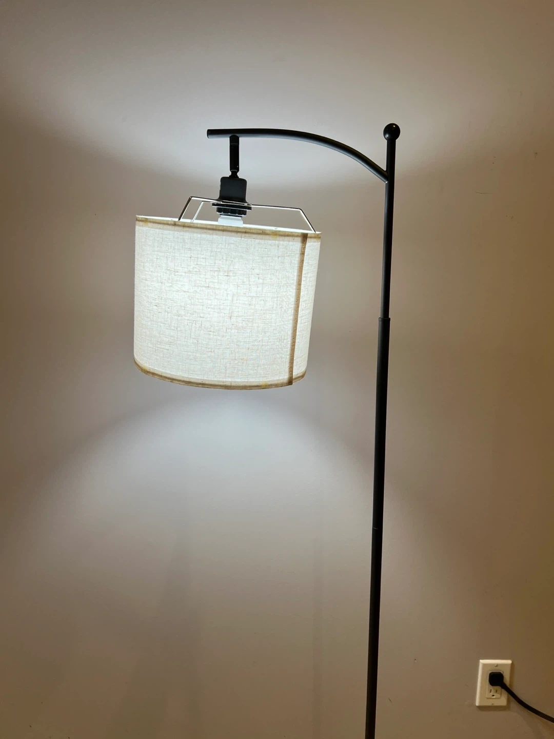 This black arc floor lamp features a textured fabric lampshade. It's a stylish addition to any room, providing ample light. Comes with a standard light bulb and power cord.