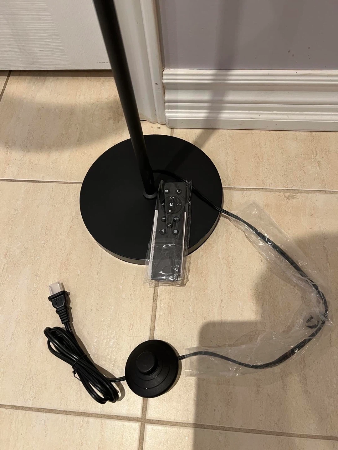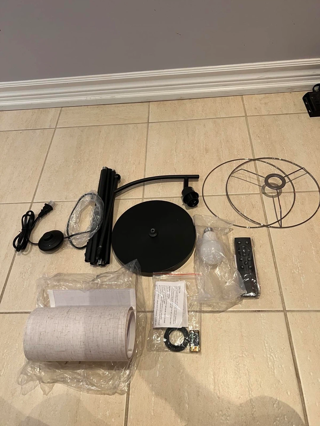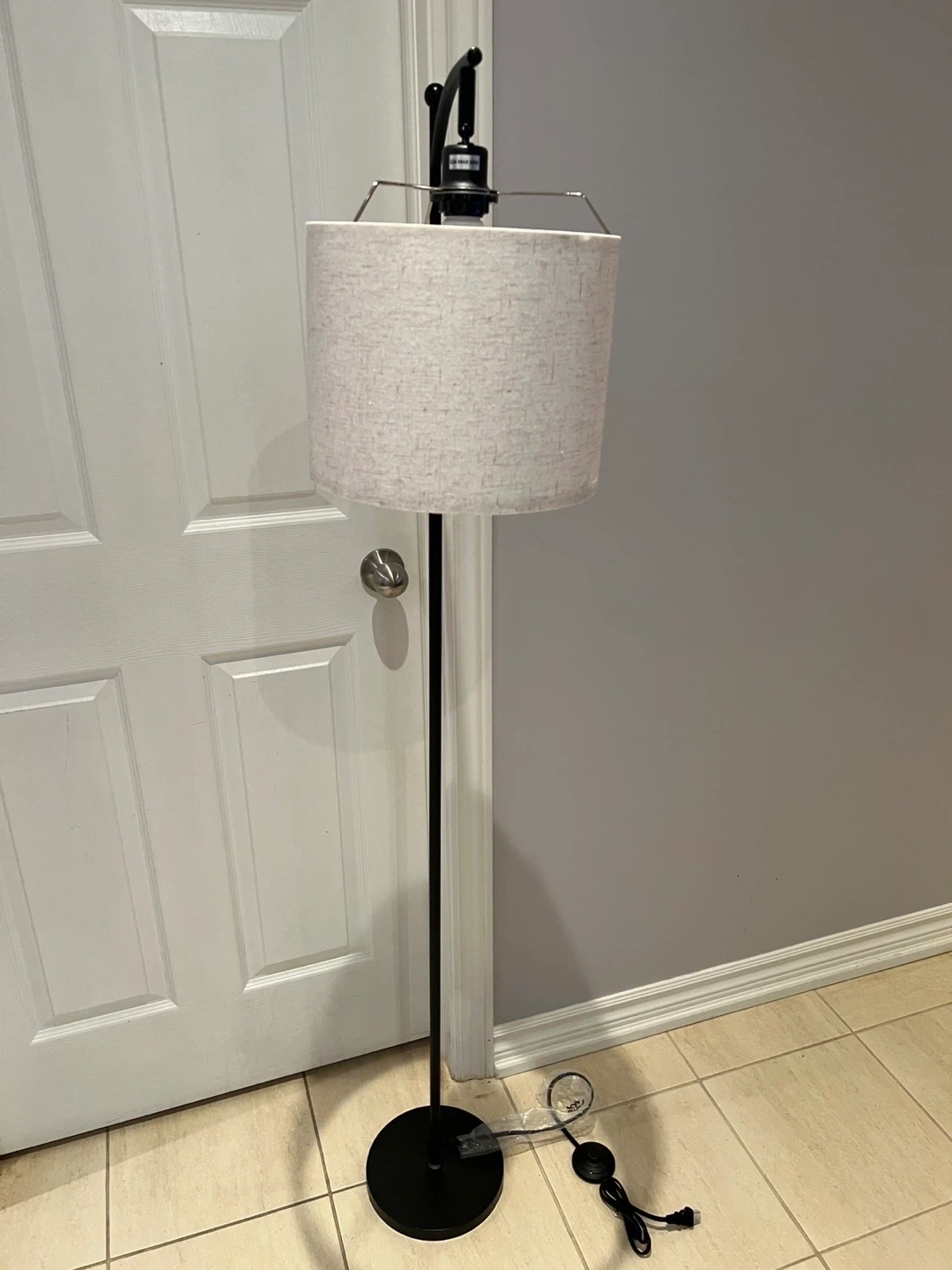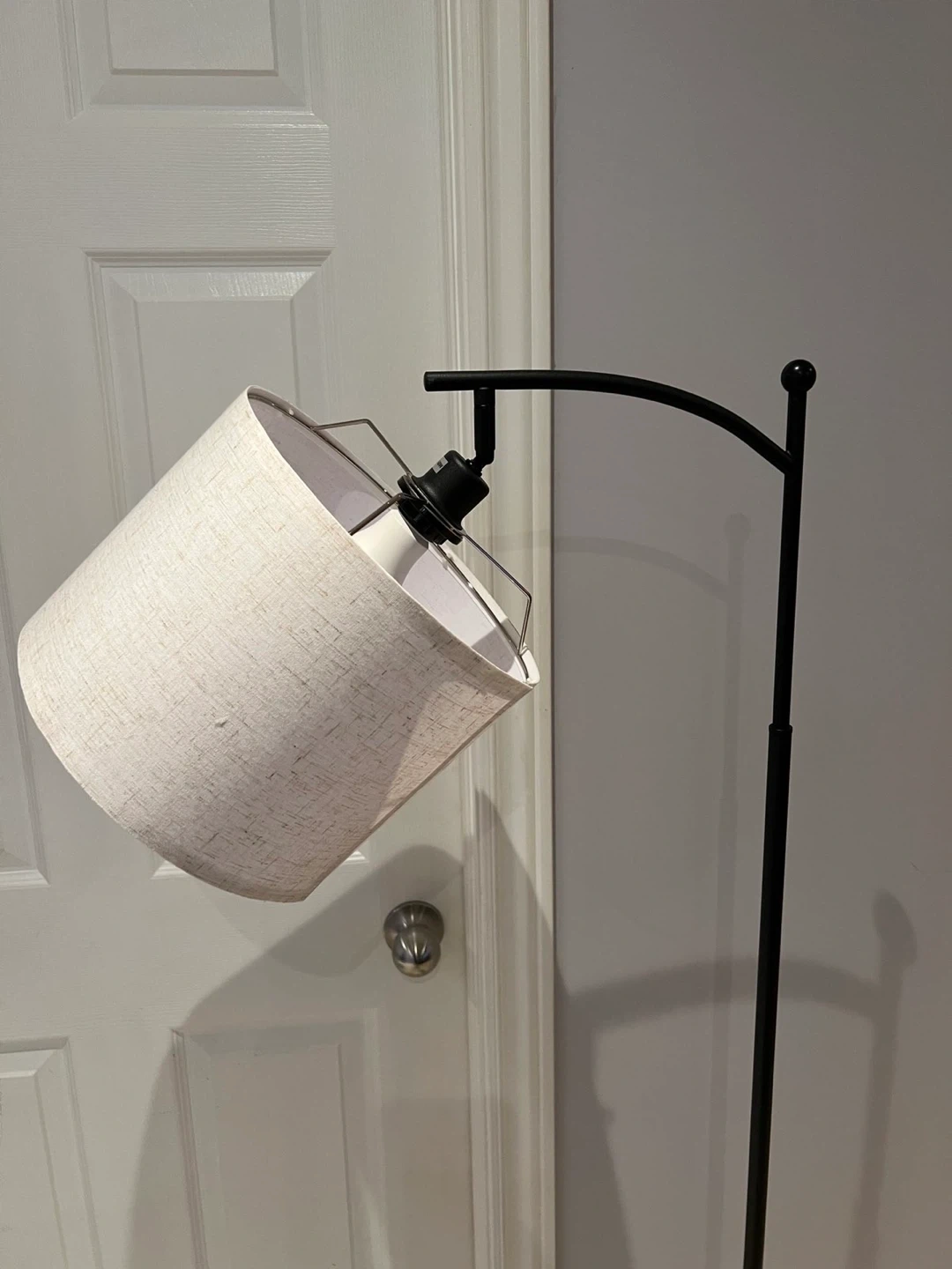 This black arc floor lamp features a textured fabric lampshade. It's a stylish addition to any room, providing ample light. Comes with a standard light bulb and power cord.