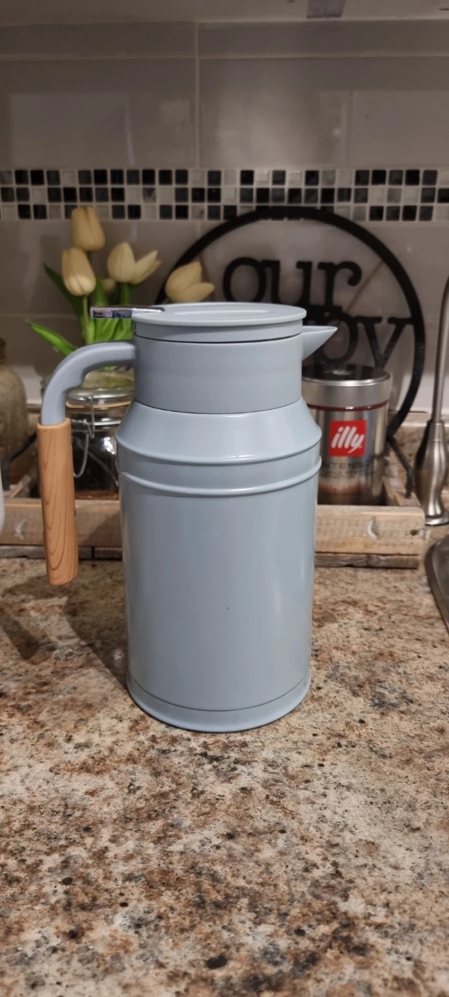 This thermos carafe is light grey with a wooden handle. It's perfect for keeping beverages hot or cold. The lid has a push-button release for easy pouring.