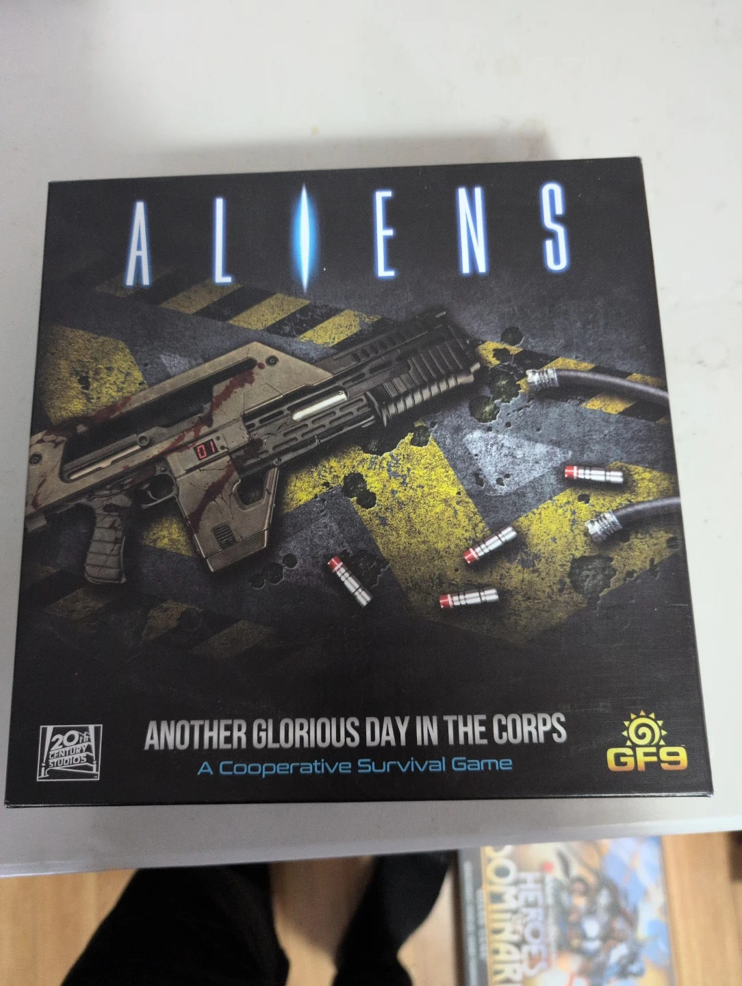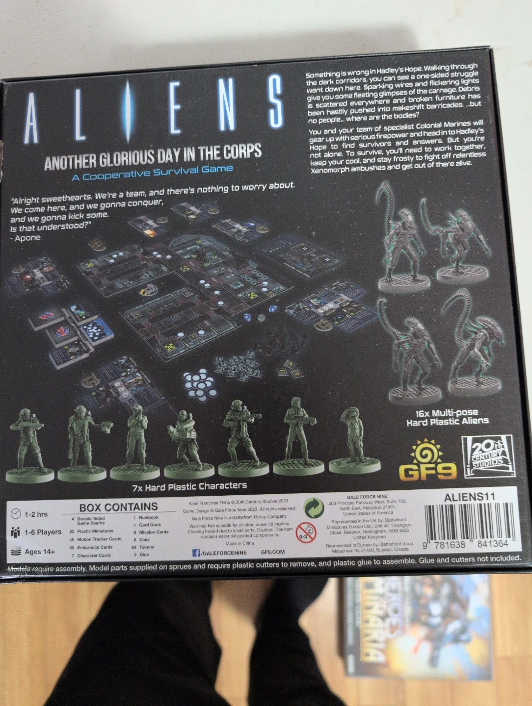 This is the Aliens: Another Glorious Day in the Corps cooperative survival board game. It includes 7x hard plastic characters and 16x multi-pose hard plastic aliens. Designed for 1-6 players with a playtime of 1-2 hours. Ages 14+.