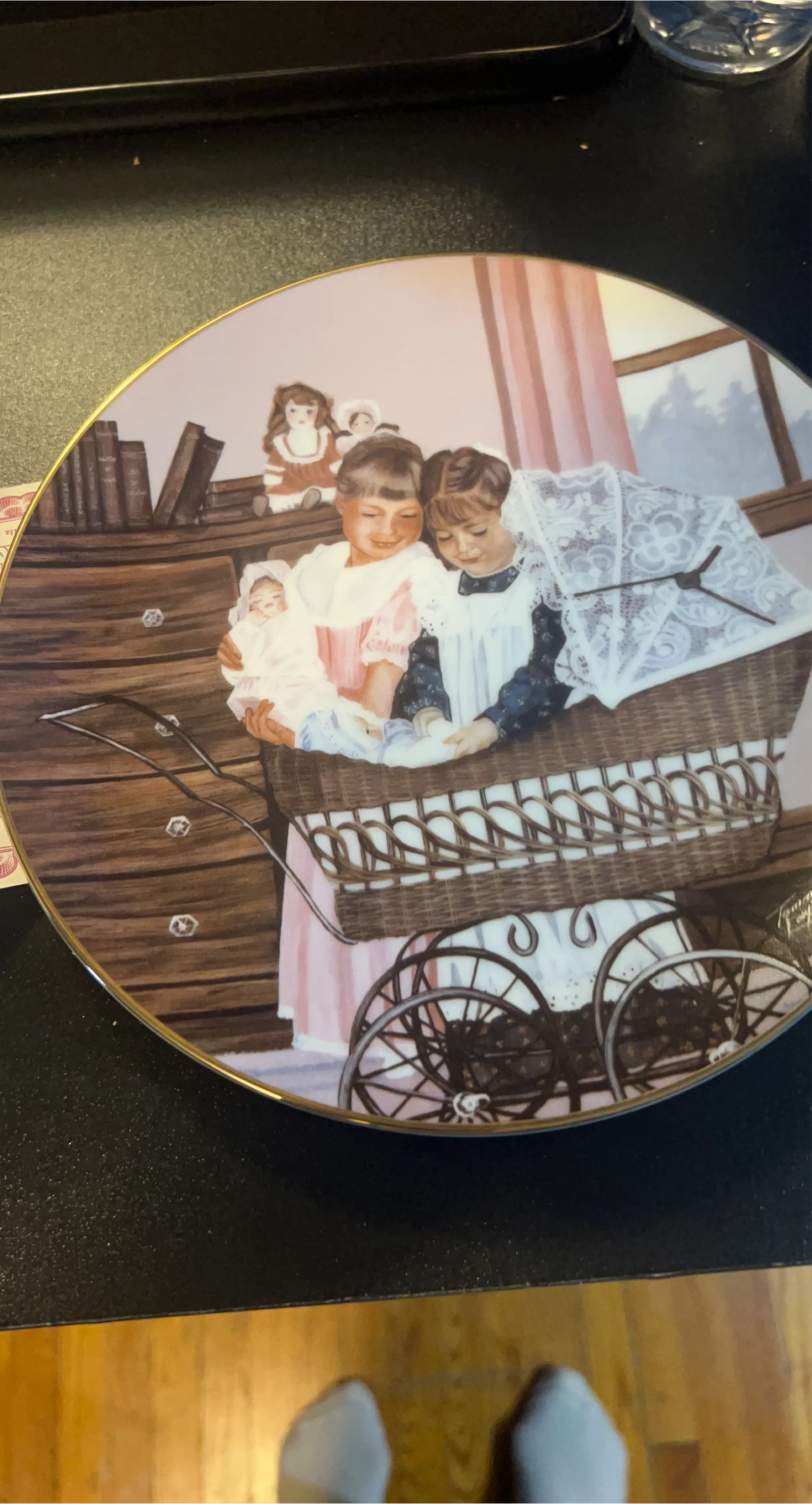 A charming decorative plate featuring a painting of two young girls tending to a baby in a pram, evoking a nostalgic Victorian scene. The plate has a gold-trimmed edge and is perfect for display or adding a touch of vintage charm to your decor.