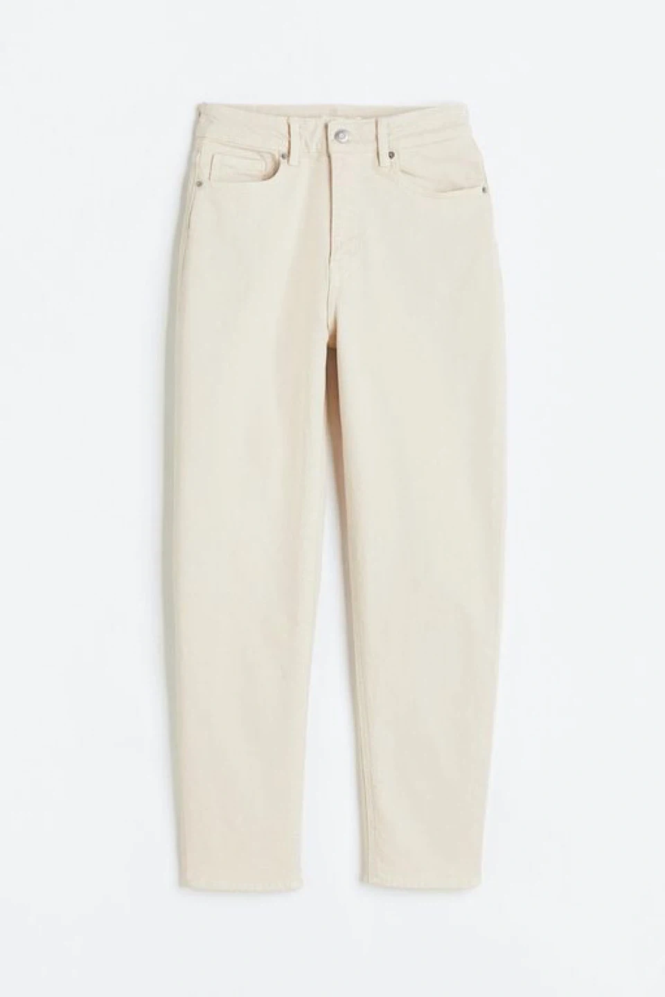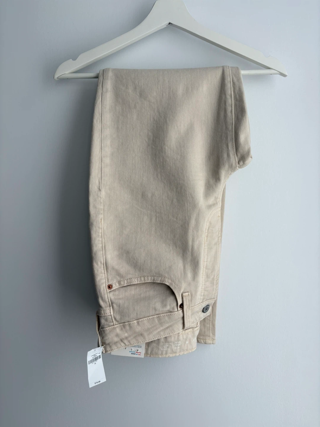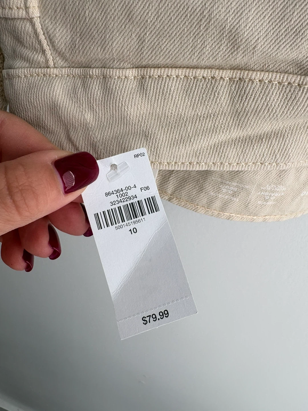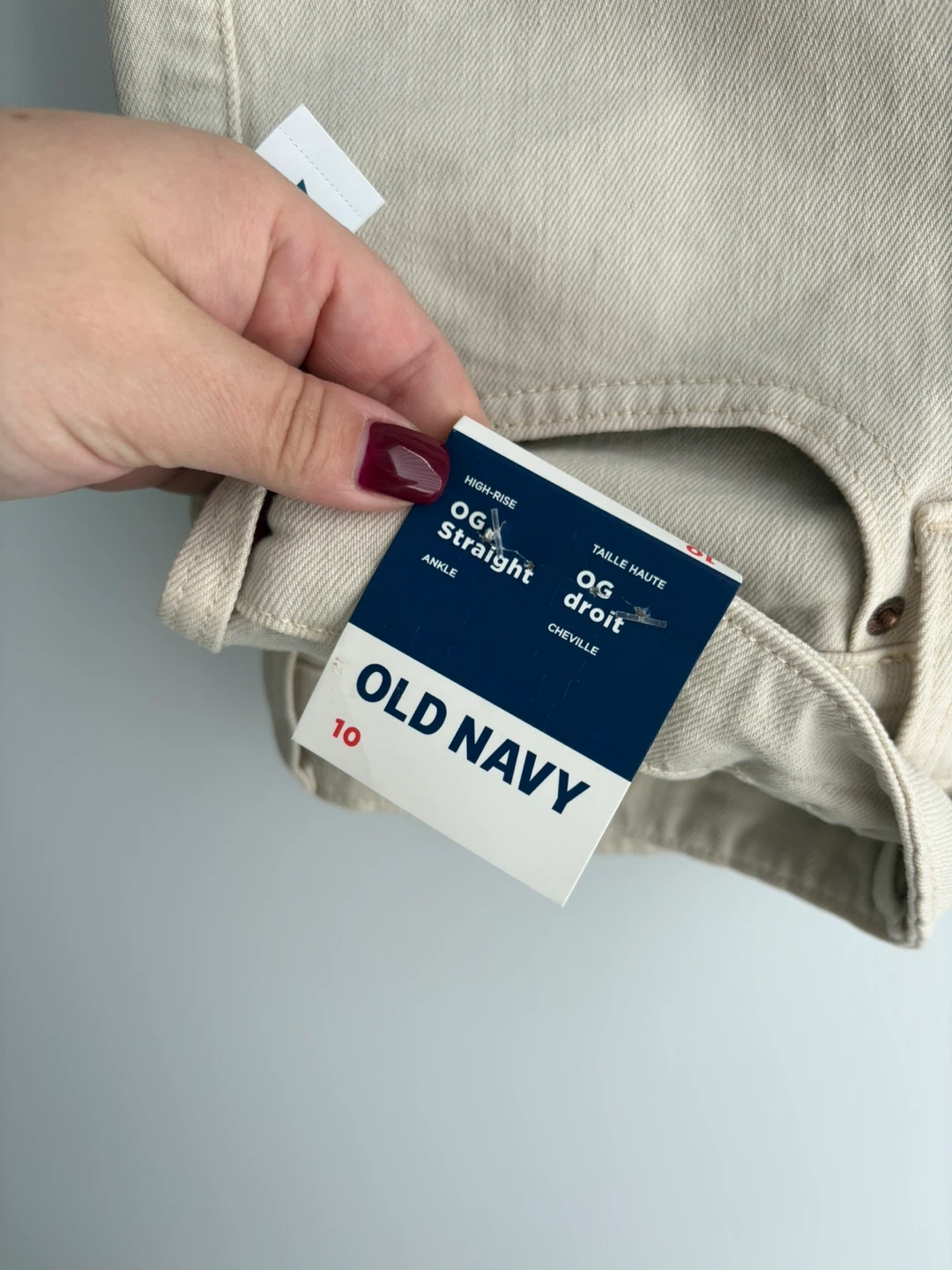 These are Old Navy high-rise straight leg jeans in a beige colour. Size 10, with a 27-inch inseam.