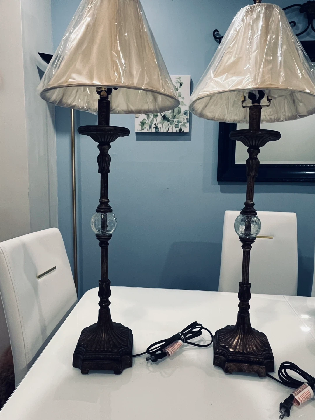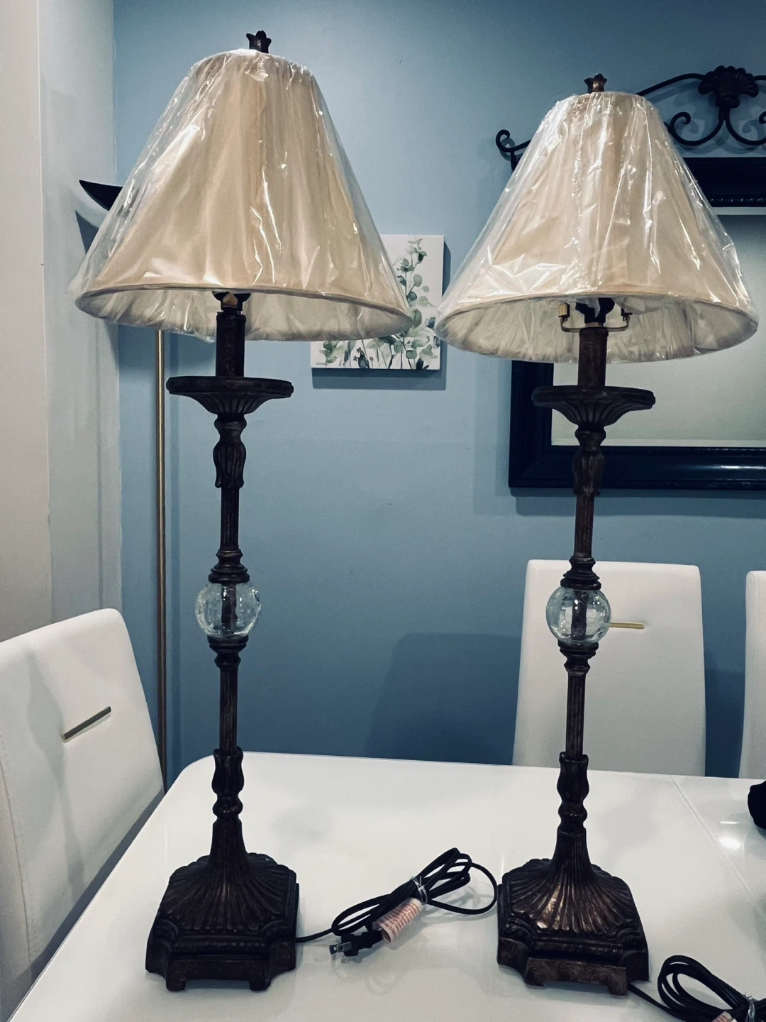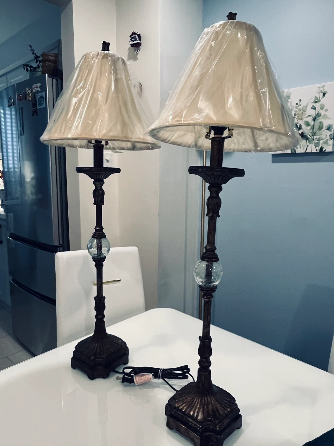 A set of two vintage-inspired table lamps with ornate bases and textured beige lampshades. Each lamp features a decorative glass orb accent on its stem. The lampshades are still in their protective plastic wrap. They'd add a touch of classic elegance to any room!