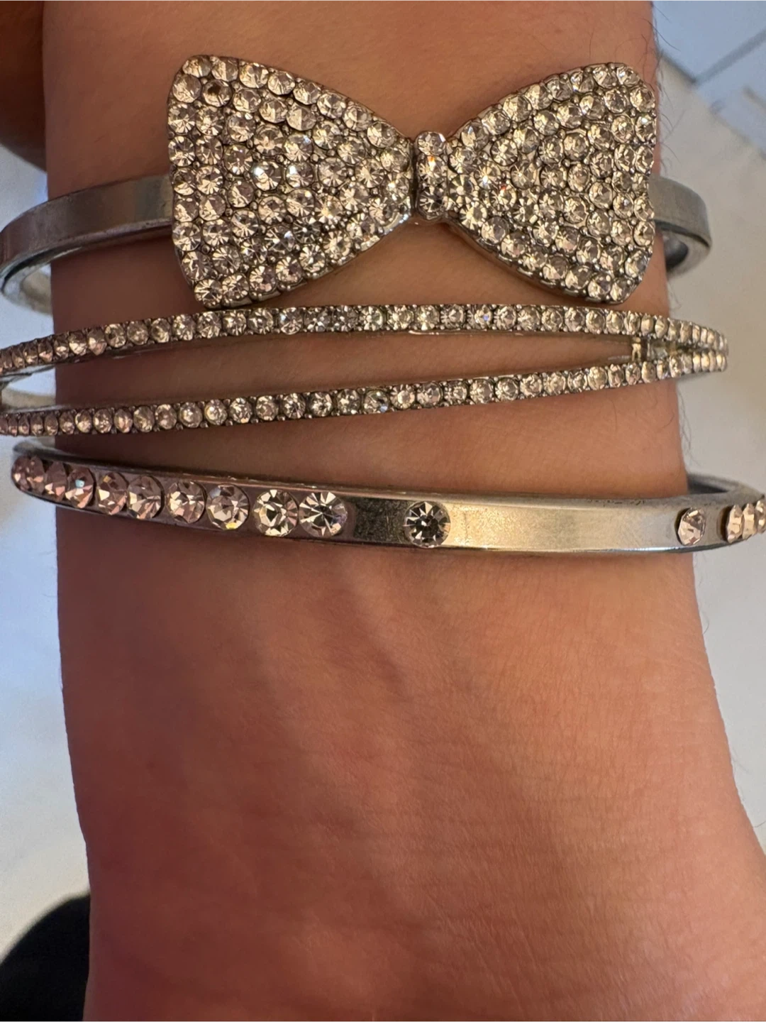 This set includes three silver-toned bracelets, one featuring a sparkly rhinestone bow. The other two bracelets are thin bands adorned with clear rhinestones. Great for adding a touch of sparkle!