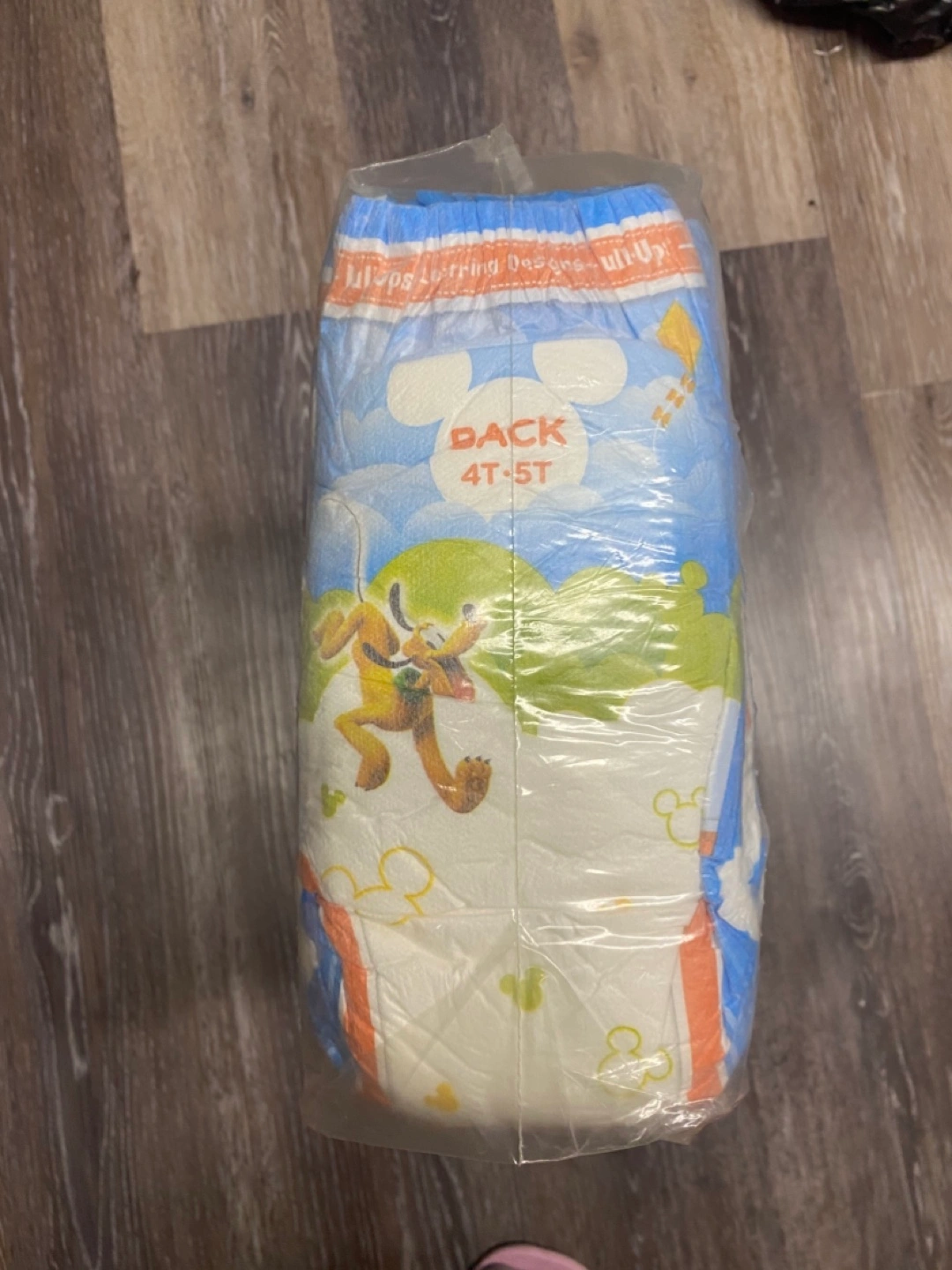 Disney Mickey Mouse pull-up training pants. Size is 4T-5T. 40 pieces in total. It's a pack of diapers featuring Pluto and Mickey Mouse.