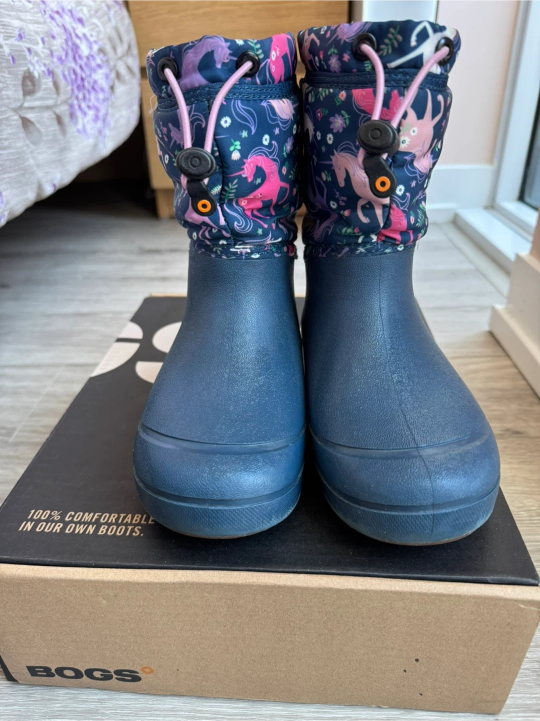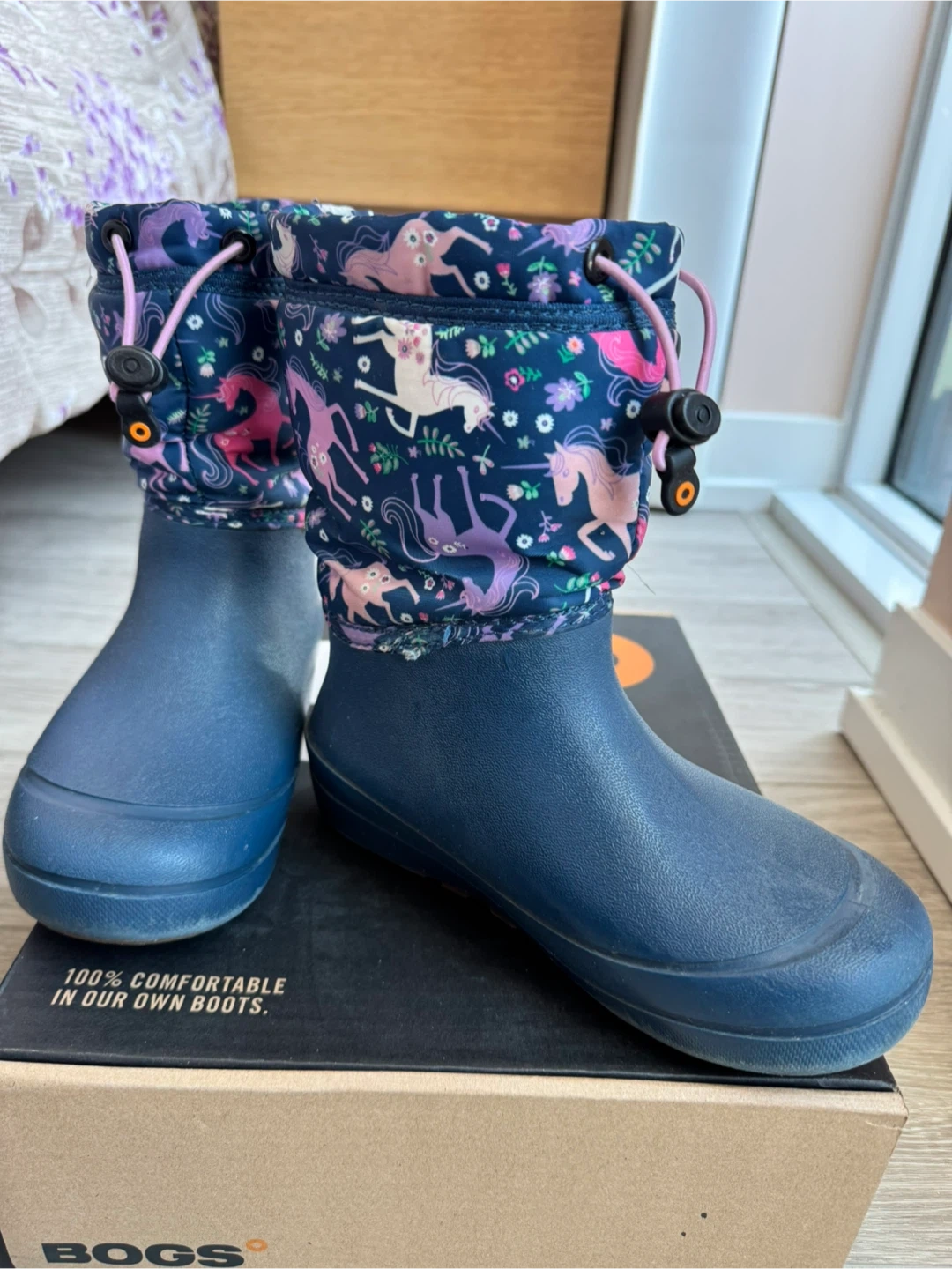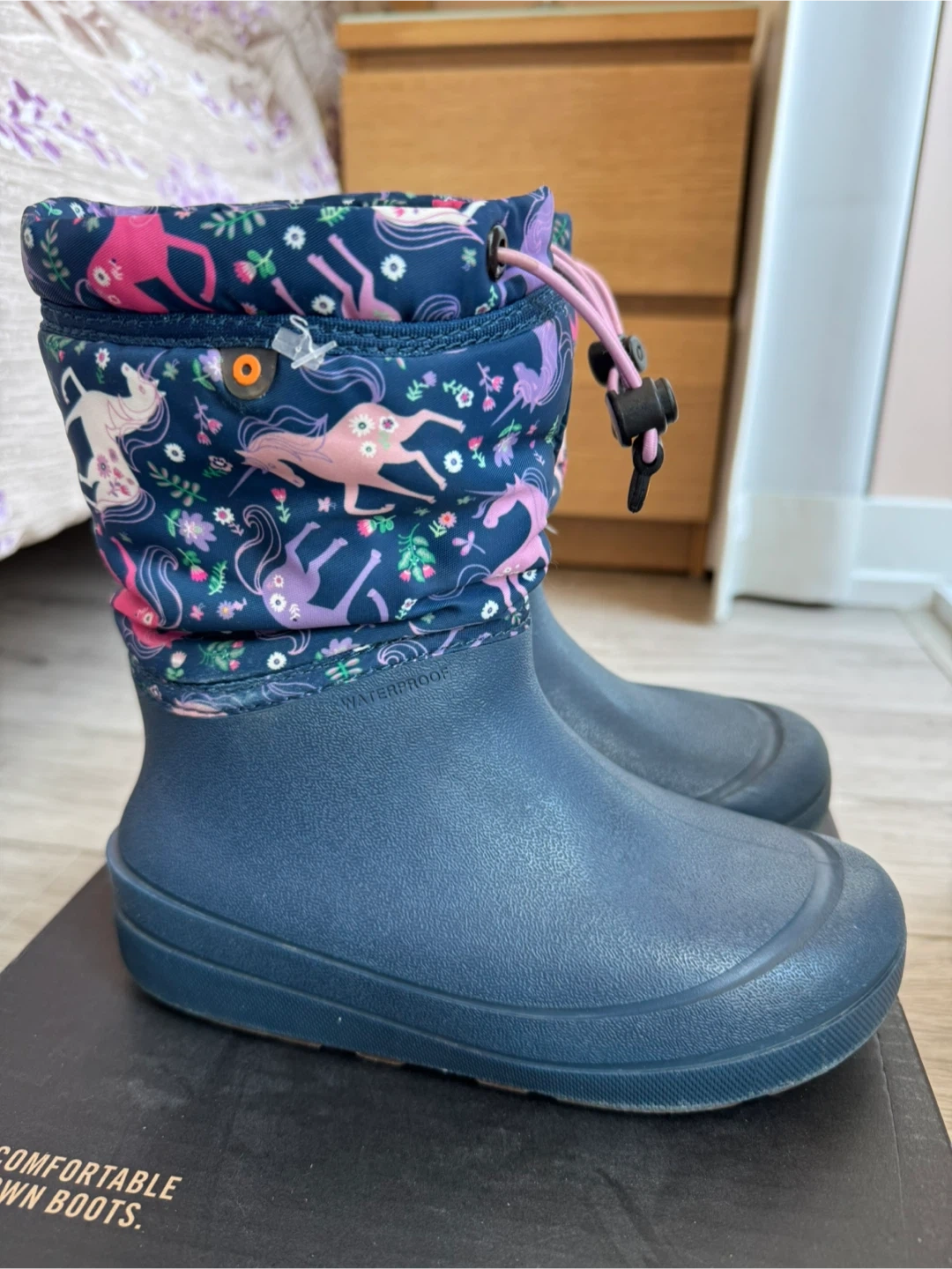 These Bogs "Snowfall Unicorn" boots are designed for kids. They're waterproof and feature a fun unicorn print. Easy pull-on design with a drawstring for a snug fit.