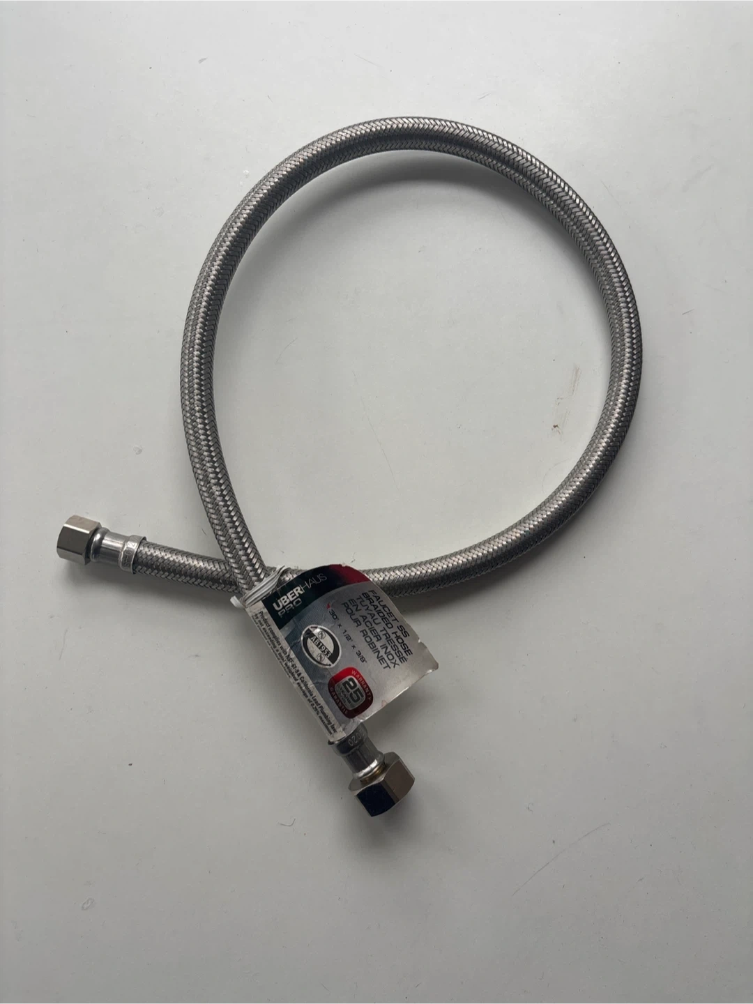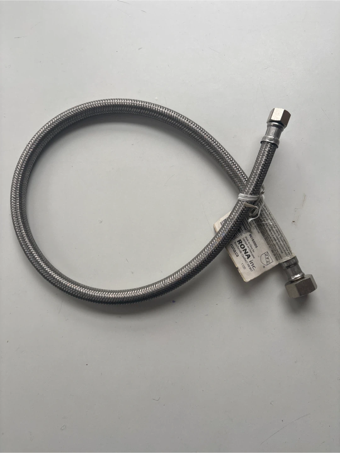 Flexible stainless steel braided water supply line hose for faucets. It's 16 inches long and connects securely with standard fittings. This hose is built for durability and reliable water flow.