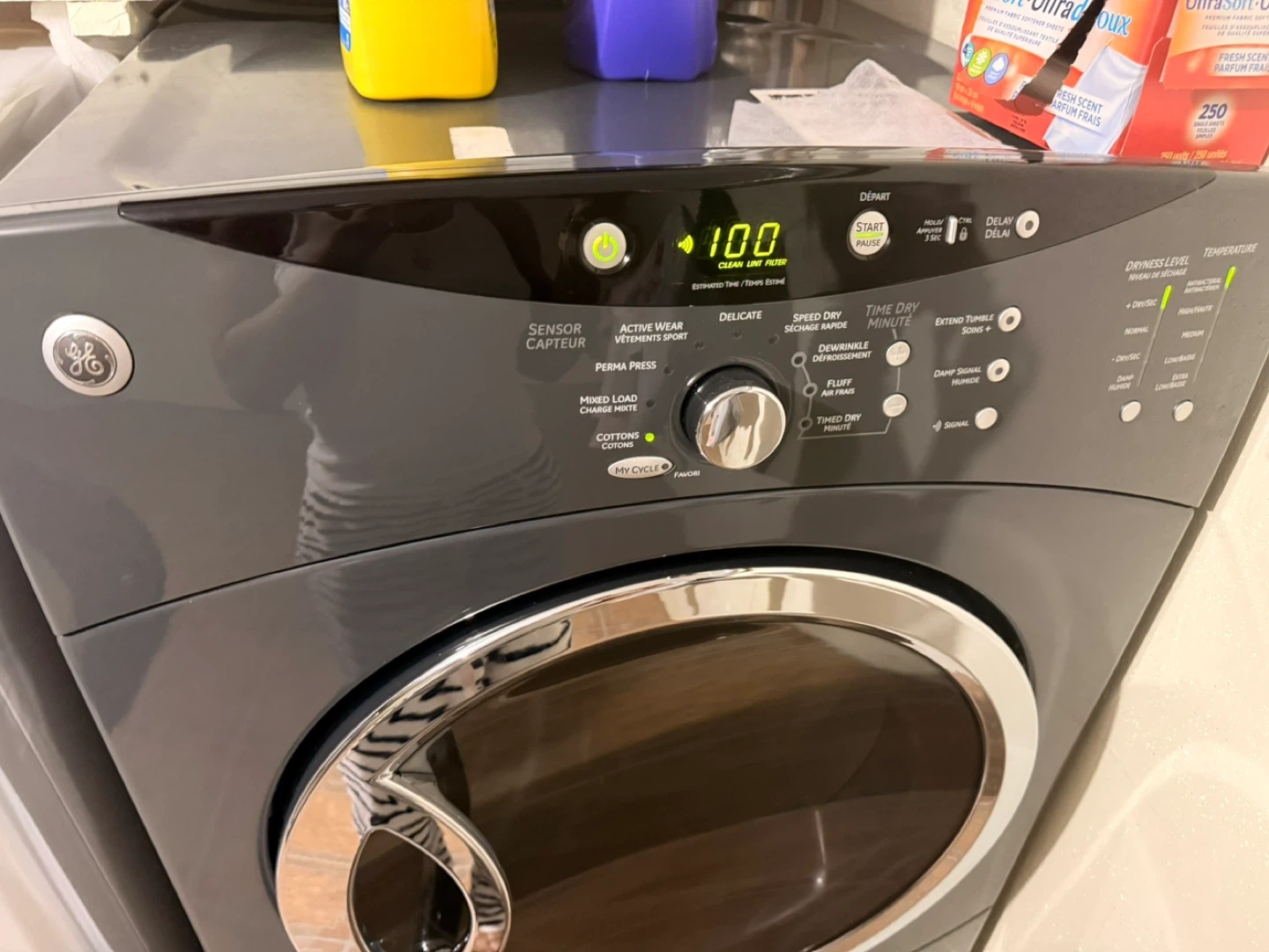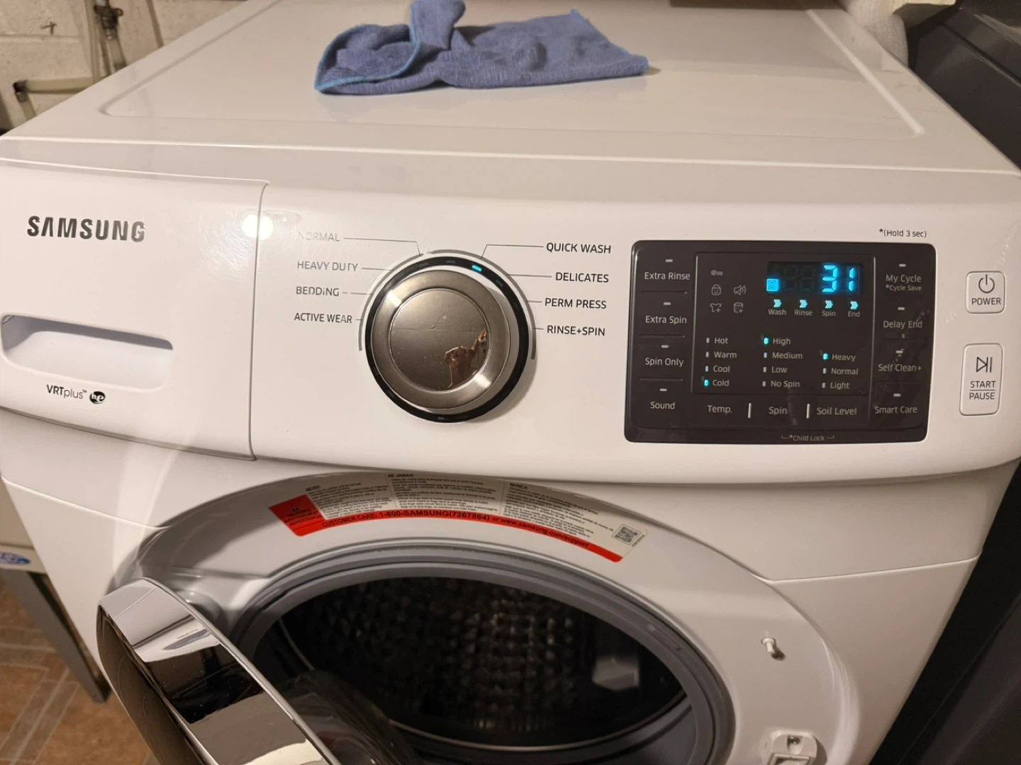 This is a white Samsung front load washing machine with VRT Plus technology. It features multiple wash cycles including Normal, Heavy Duty, Bedding, Active Wear, Quick Wash, Delicates, and Perm Press. It offers various temperature settings like Hot, Warm, Cool, and Cold, as well as spin speeds and soil levels. This machine is great for a variety of laundry needs!