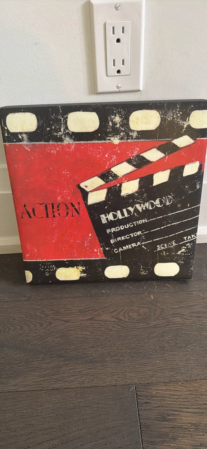 This decorative box features a classic Hollywood clapperboard design with the word 'ACTION' and 'HOLLYWOOD PRODUCTION' printed on it. Its distressed finish adds a vintage touch. The box is black and red with white accents. Porch pick up east York in Greektown