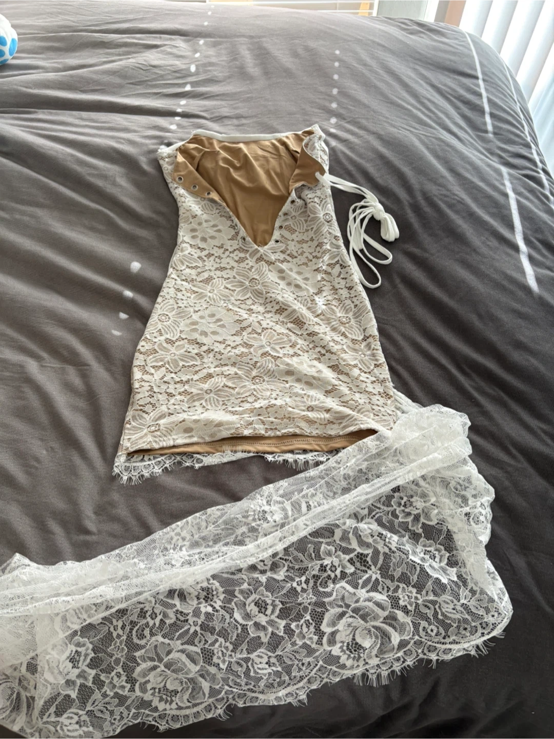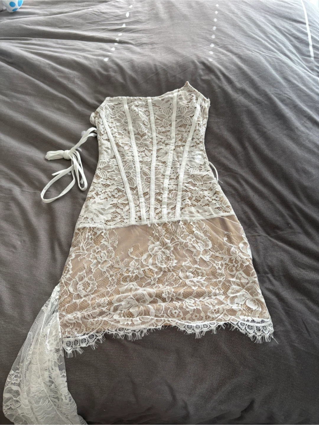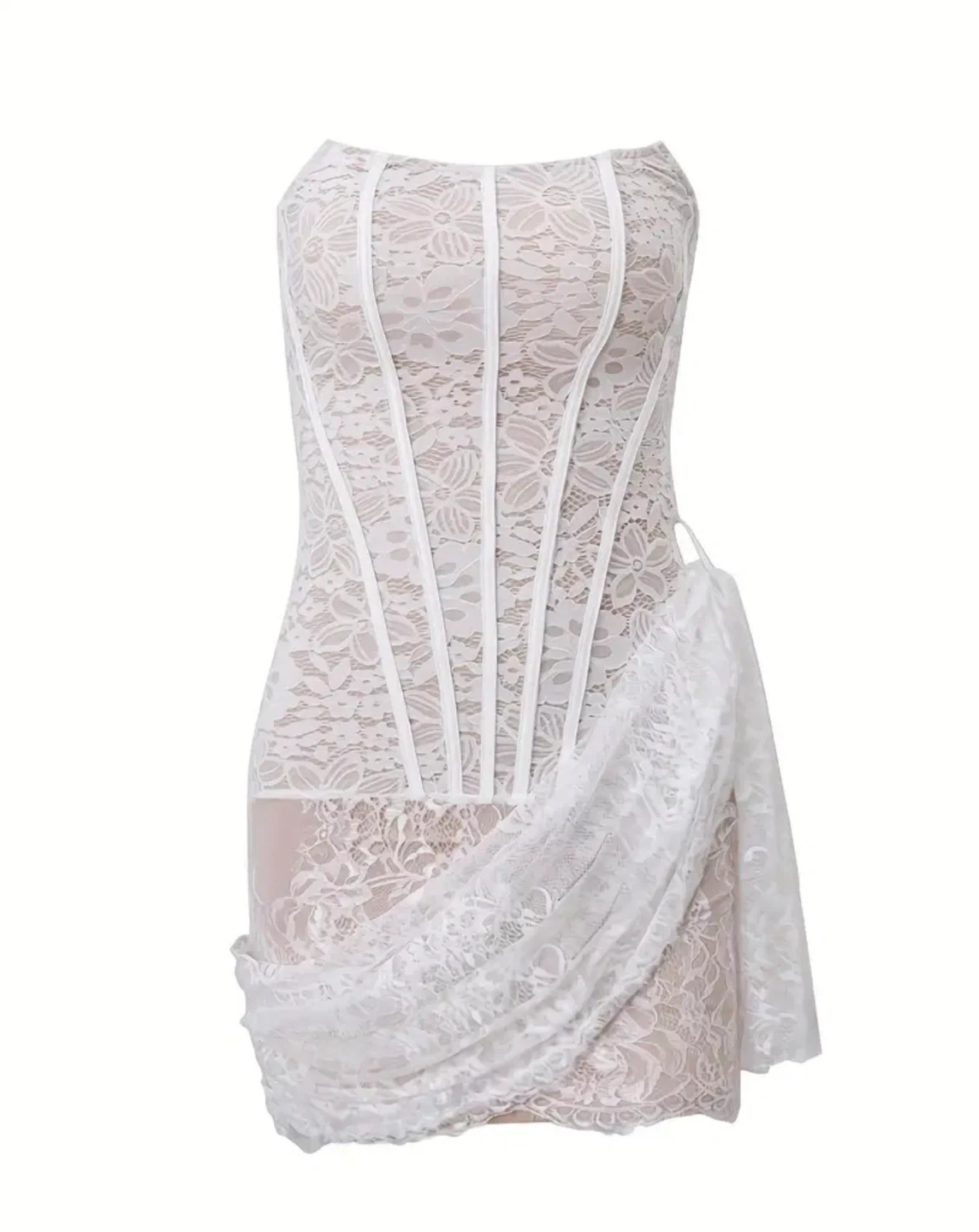 This white lace mini dress features a corset-style bodice with boning details. It includes a detachable lace skirt overlay. The dress is made of delicate floral lace with a nude lining.