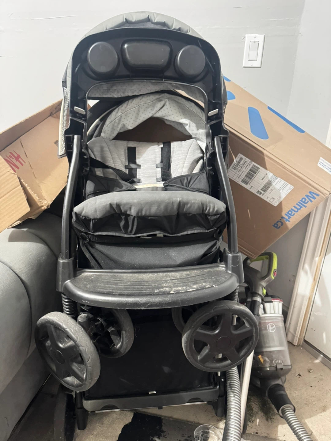 This is a Graco double seats stroller in black and grey. It has a comfortable padded seat with a 5-point harness. Easy to manoeuvre for everyday use!