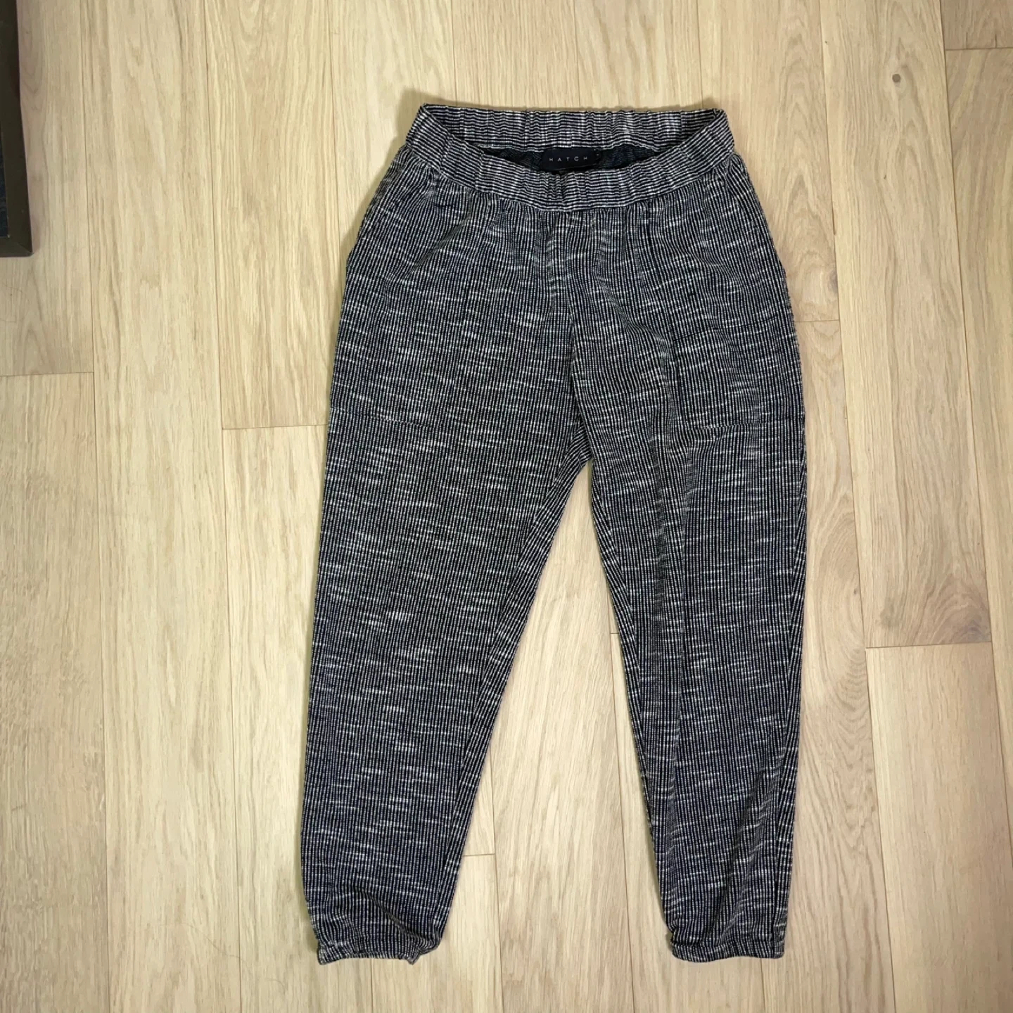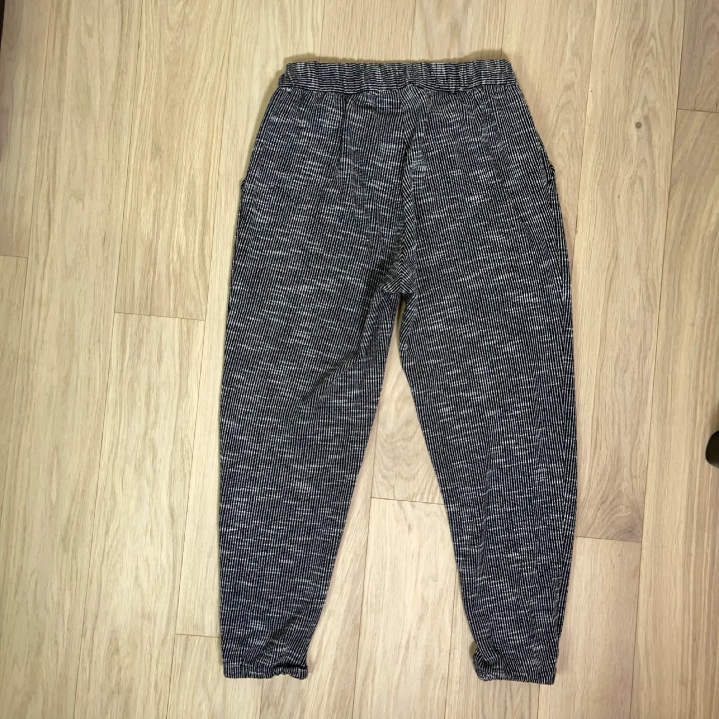 These are not basic sweats — the subtle grid/stripe weave gives them a refined, boutique feel that reads more “Anthro minimal” than athletic.