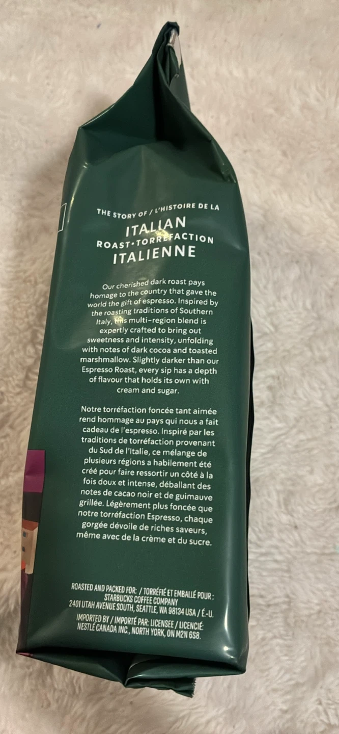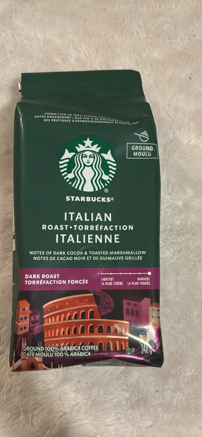 Starbucks Italian Roast ground coffee. Dark roast with notes of dark cocoa and toasted marshmallow. 340g bag.