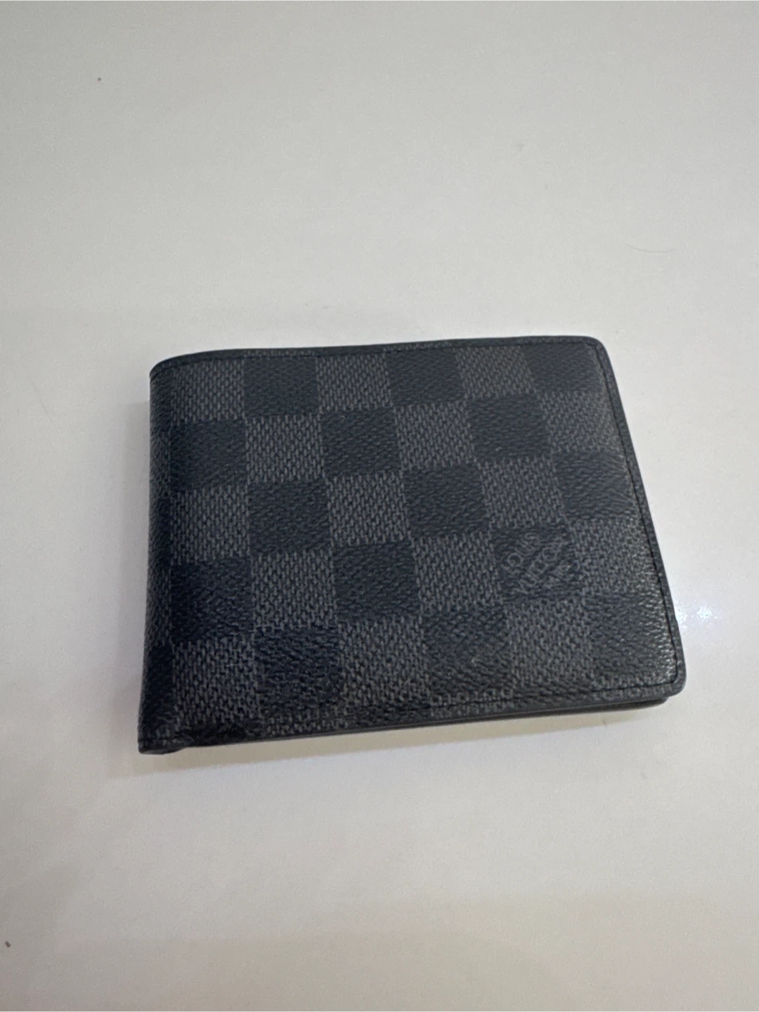 Louis Vuitton bifold wallet in Damier Graphite canvas. It features multiple card slots and a bill compartment. Made in France.